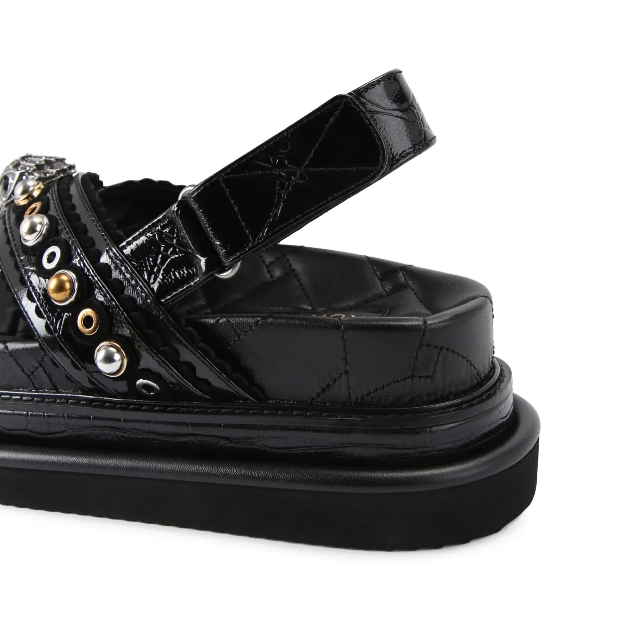 - Leather, patent upper straps, scallop details, silver-and-gold-tone studs, antiqued silver-tone eagle head