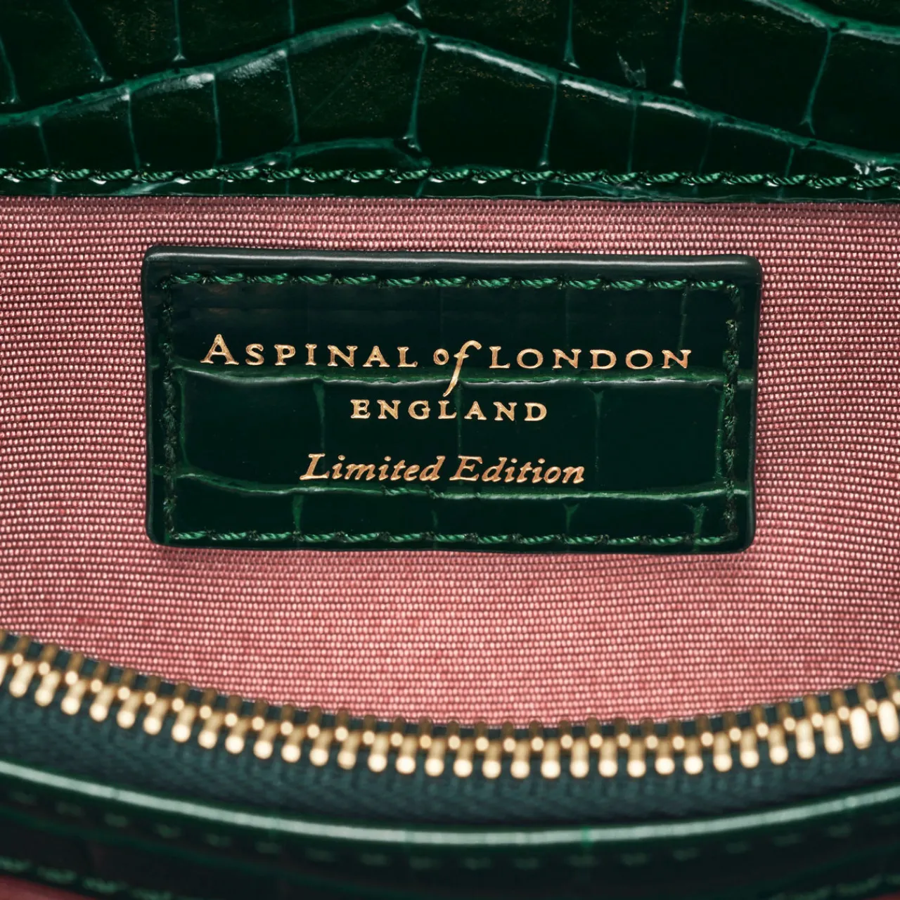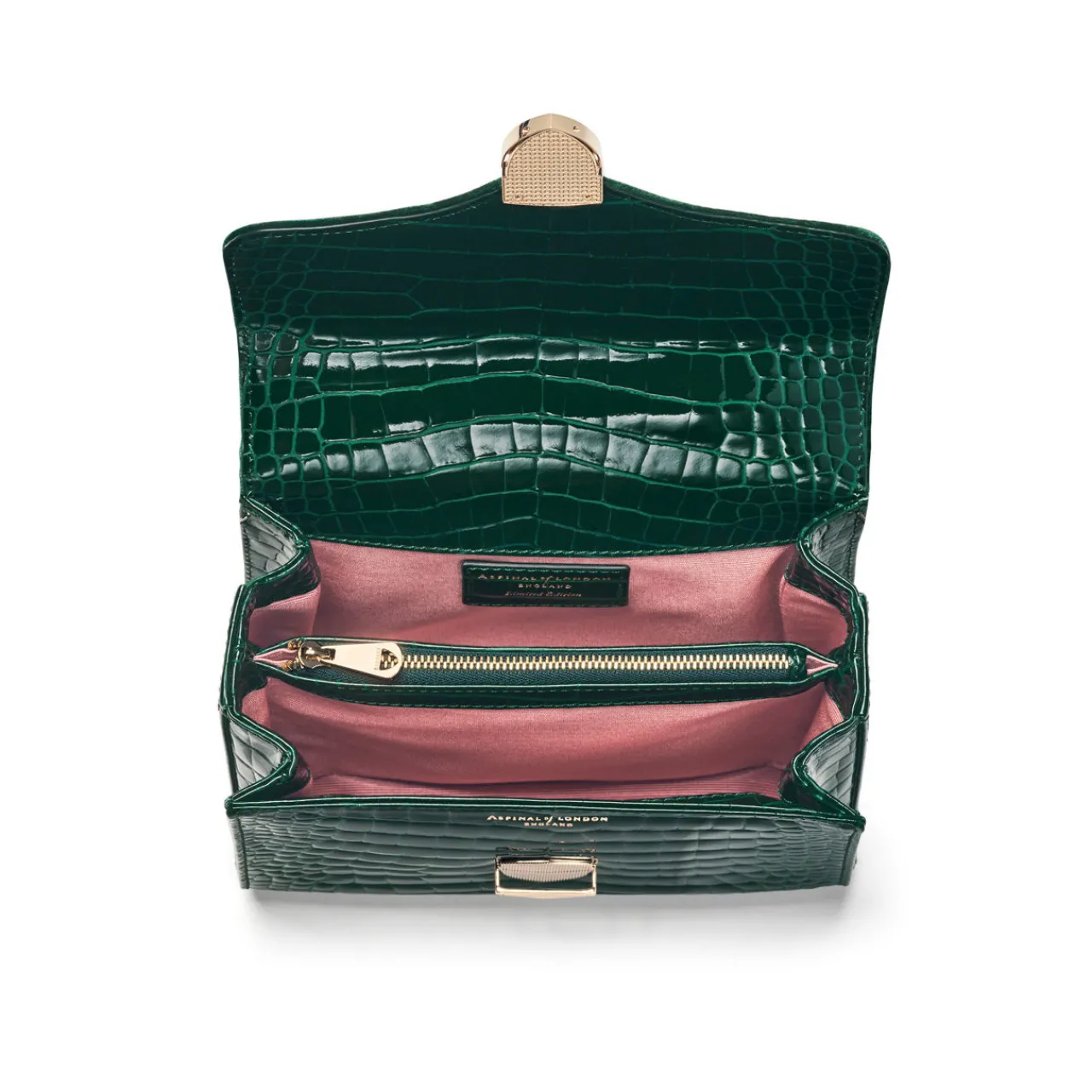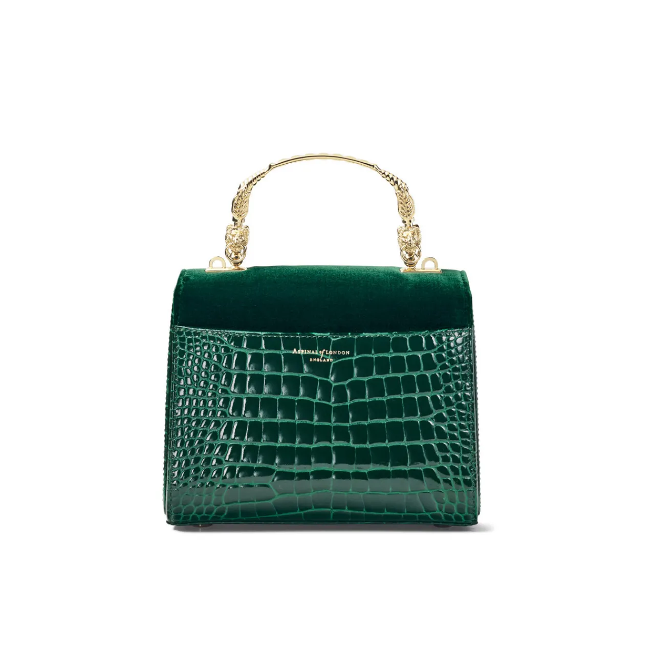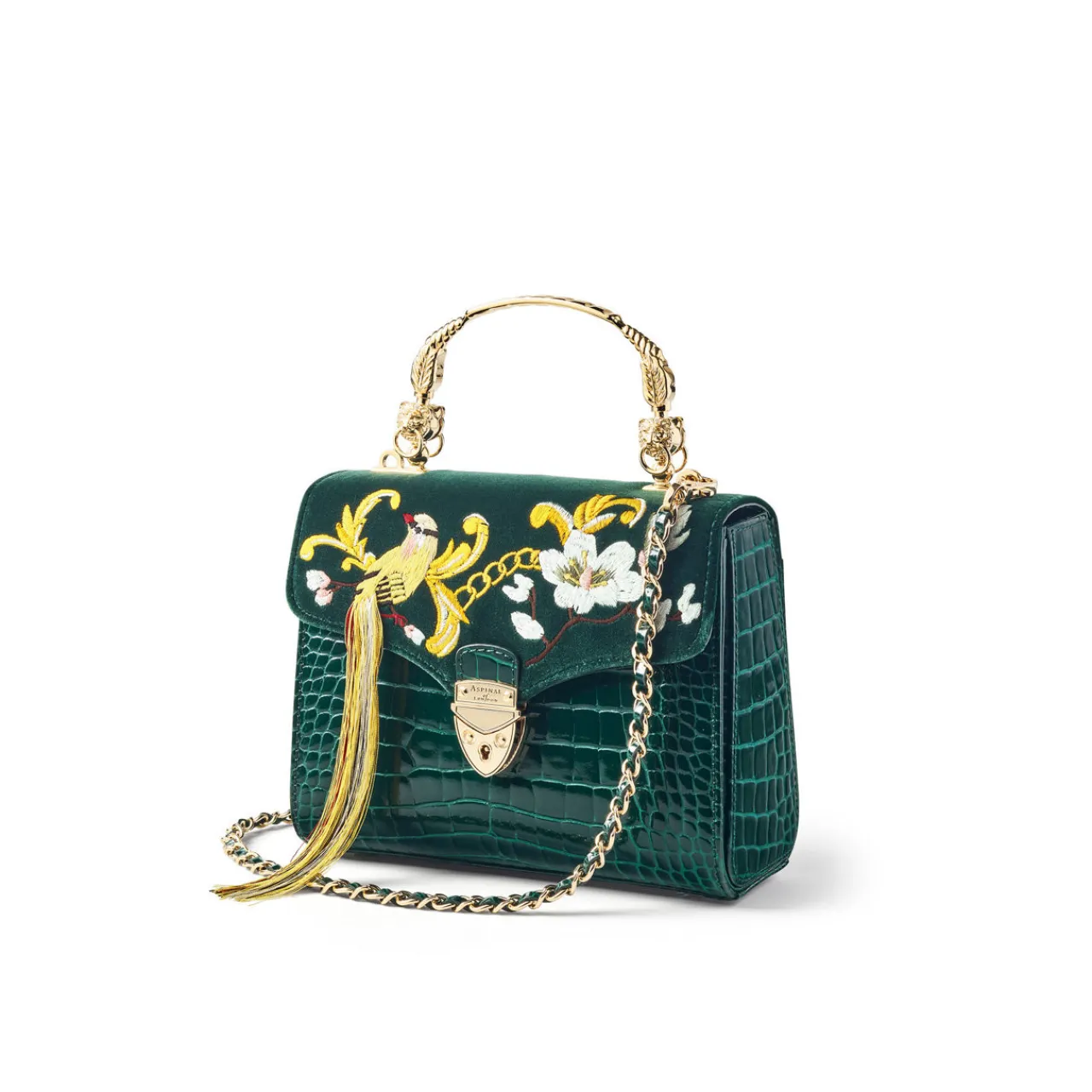 - Ornate signature gold lion’s head metal top handle, flap closure with signature shield lock fastening, detachable chain-plaited strap, one exterior pocket with magnetic fastening, gold-tone hardware, limited edition signature branded patch, lined, velvet and patent-croc textured finish, hand-embroidered silk bird of paradise with tail feathers tassel