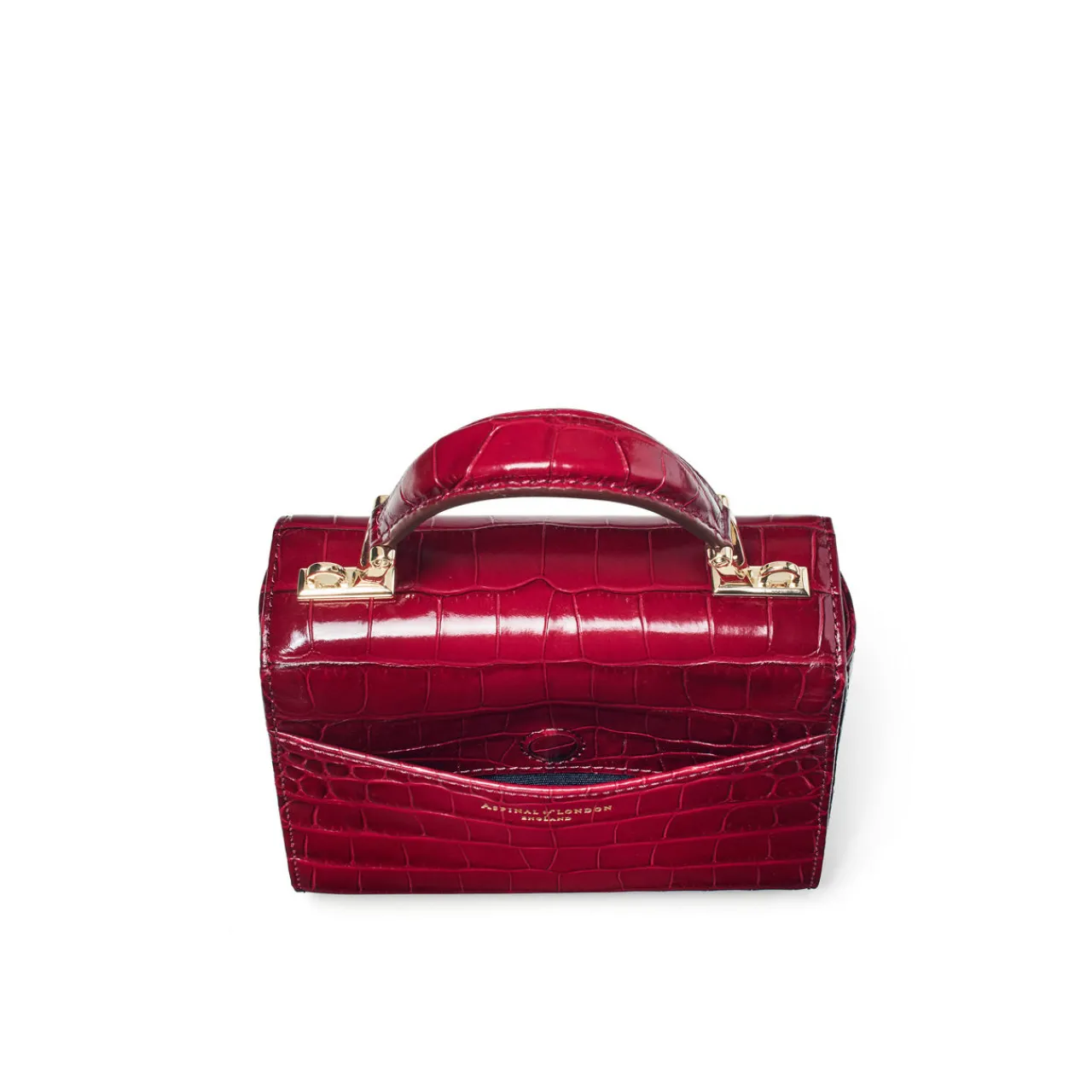 - Finest full-grain leather, signature shield lock, grosgrain lining, central zipped compartment, open side pockets, top handle, detachable chain strap, croc-embossed design
