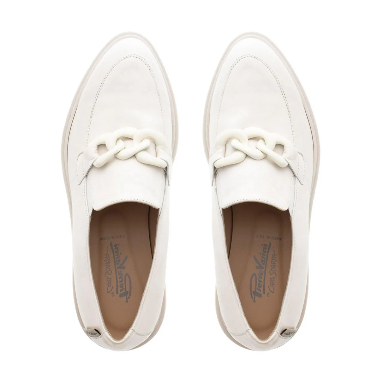 - Almond toe, loafer silhouette, tonal chain detail, cleated flatform wedge outsole, slip-on style, brand logo detail