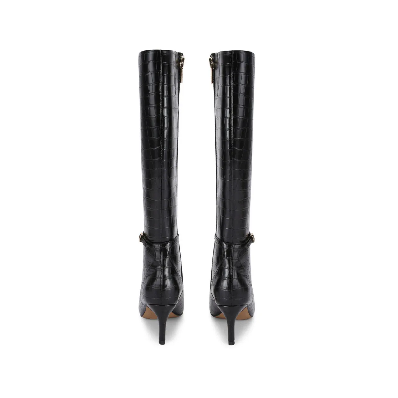 - Mock-croc embossed upper, knee-high length, slim ankle strap with gold-tone buckle, pointed toe, kitten heel