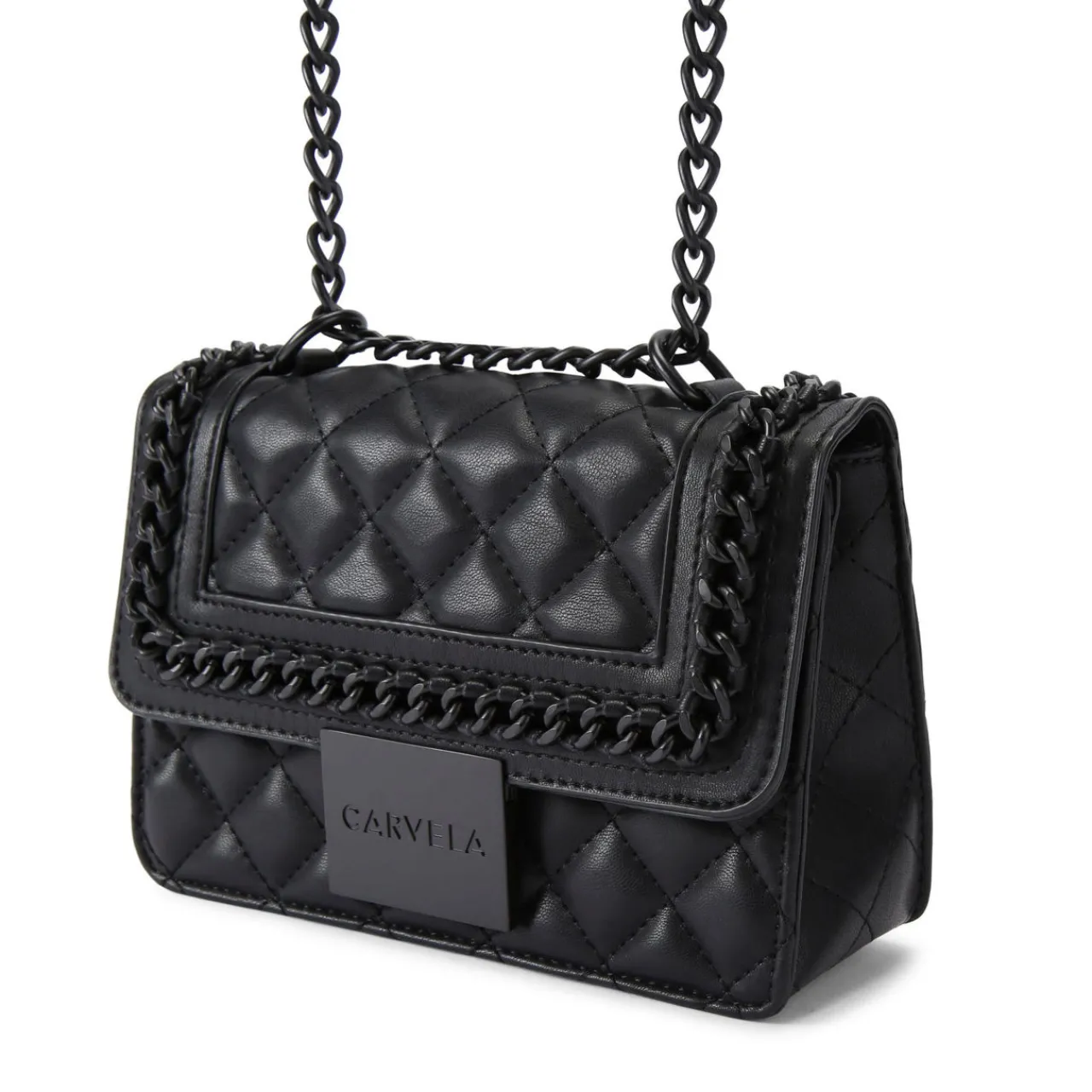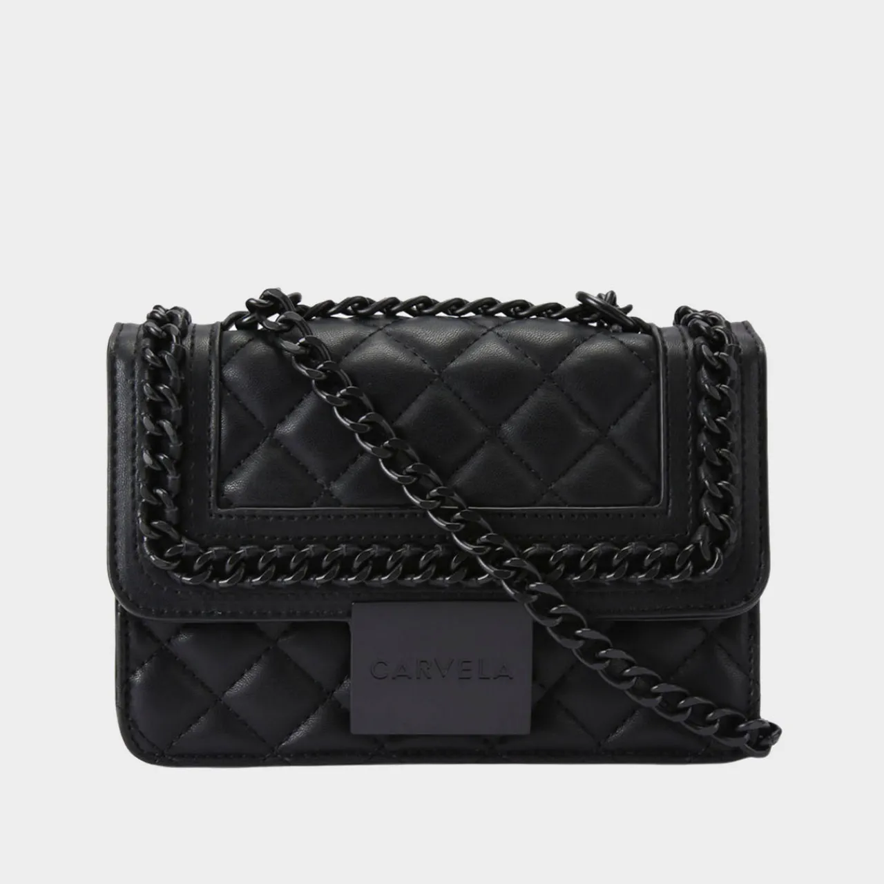 - Quilted effect, tonal hardware, chain crossbody strap, branded plate magnetic fastening, chain trim, monogrammed lining