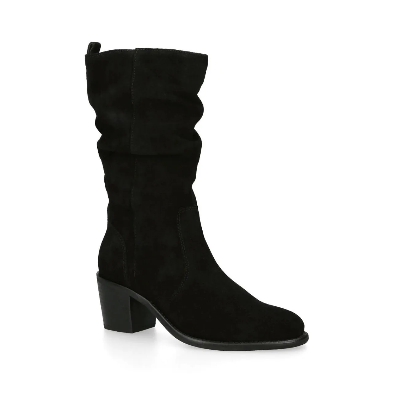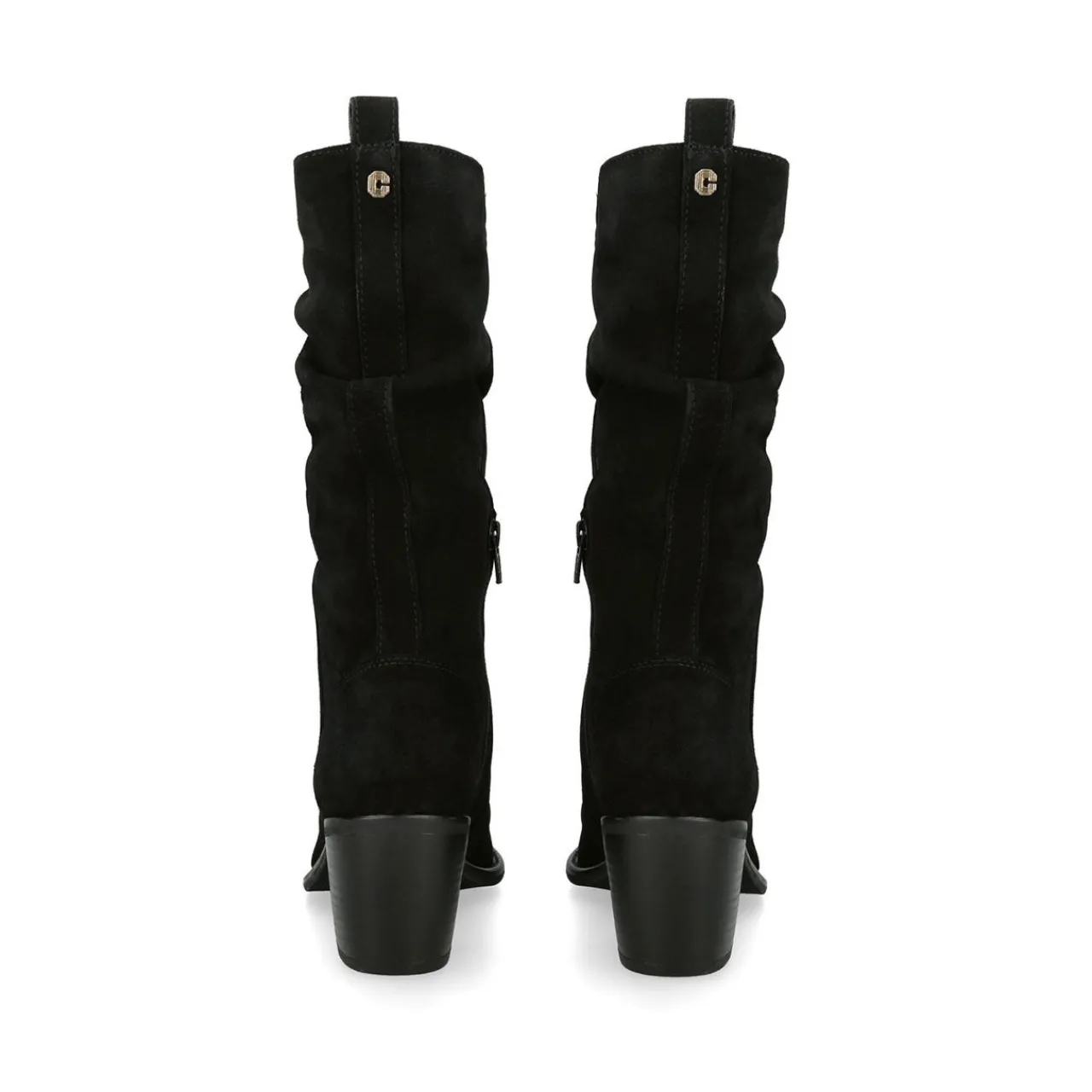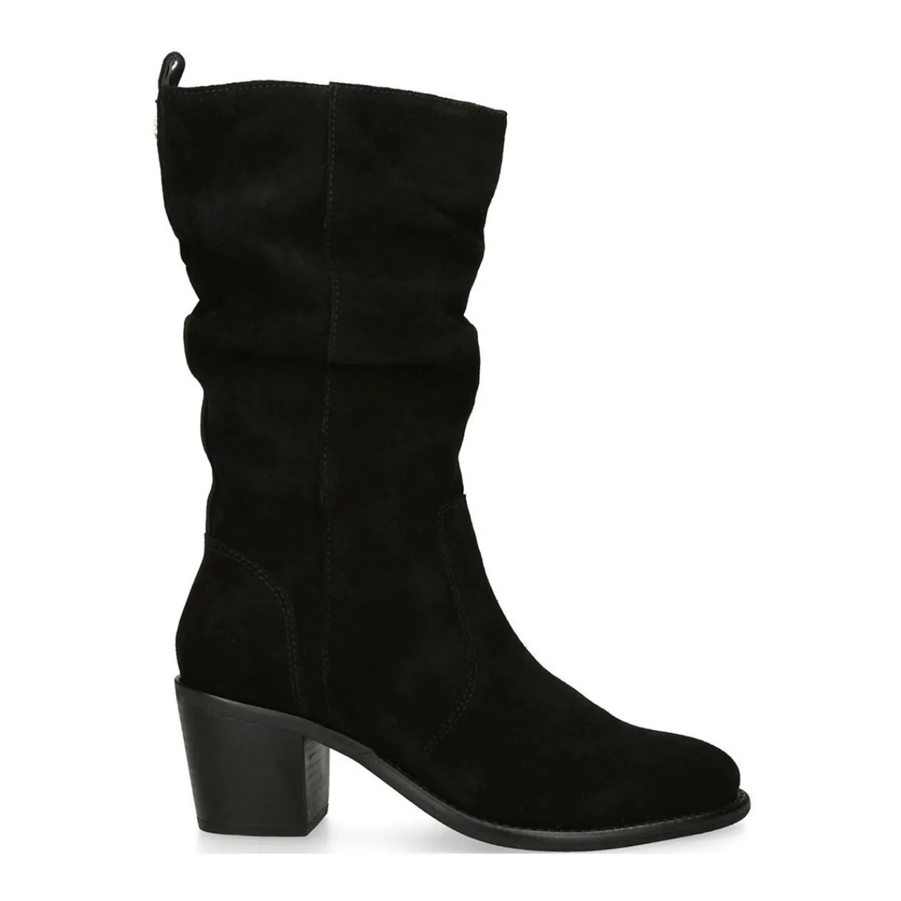 - Suede upper, ruched detail, side zip, block heel, pull tab, Icon C stud