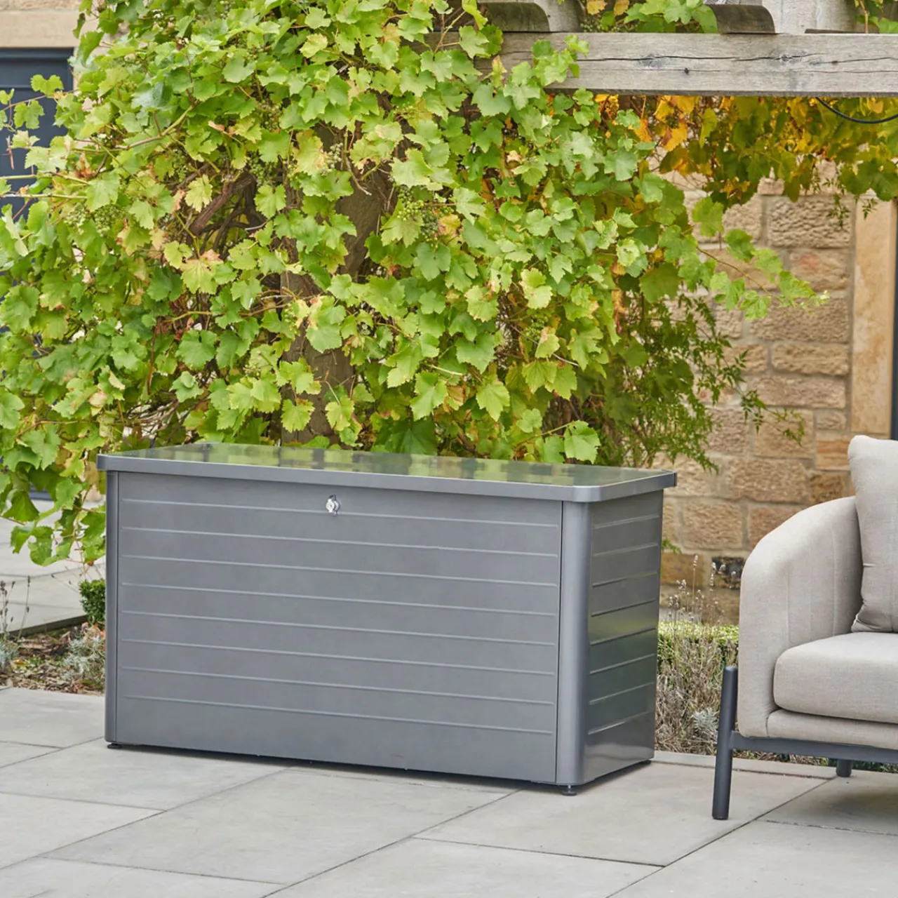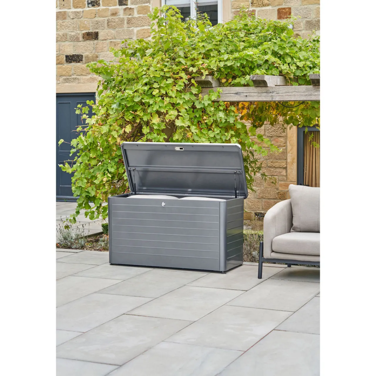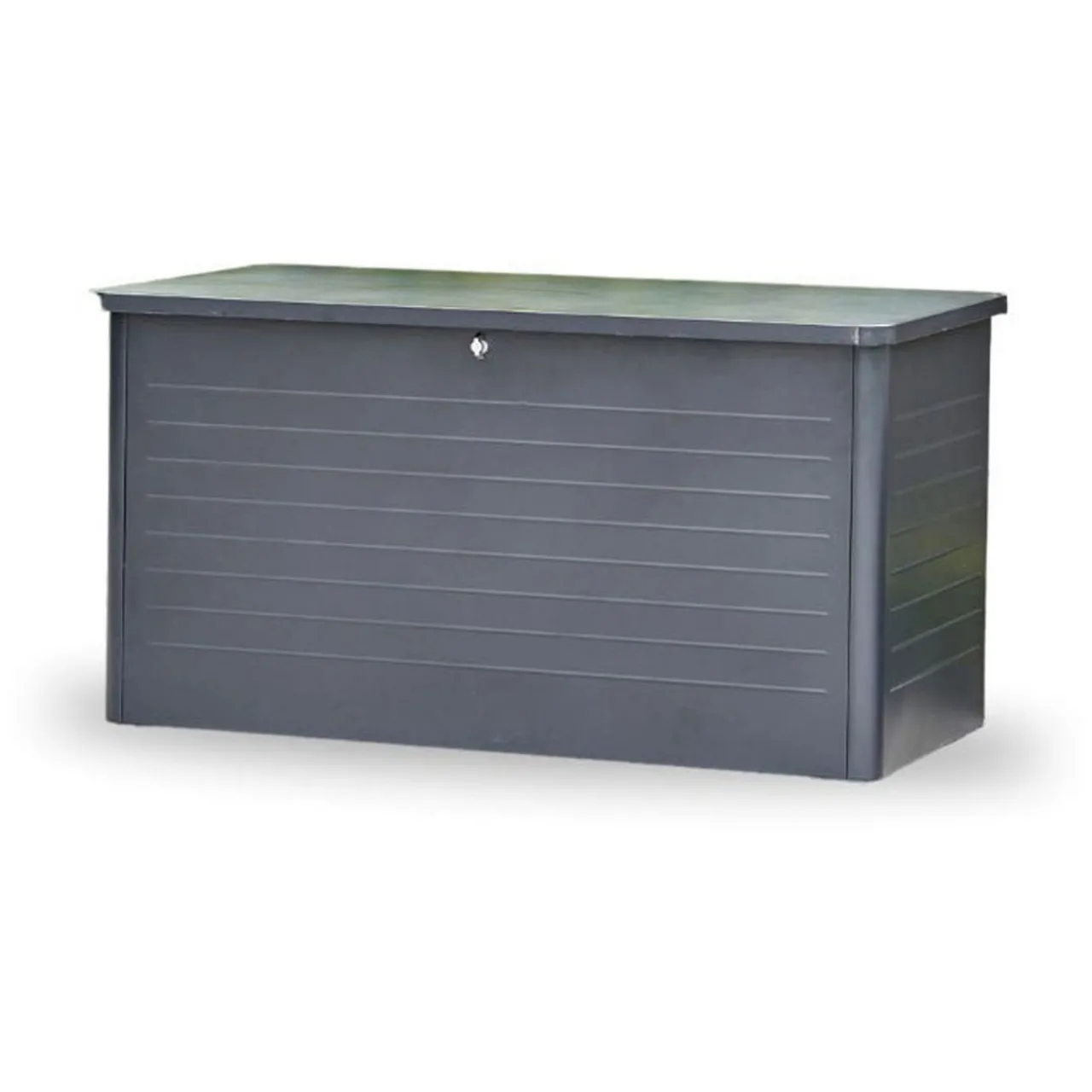 Easily store outdoor cushions and blankets with this contemporary storage box. The box features a slim, close-lat design with gas pump hinges and adjustable feet for ease of movement. This is the perfect finishing touch for any garden.