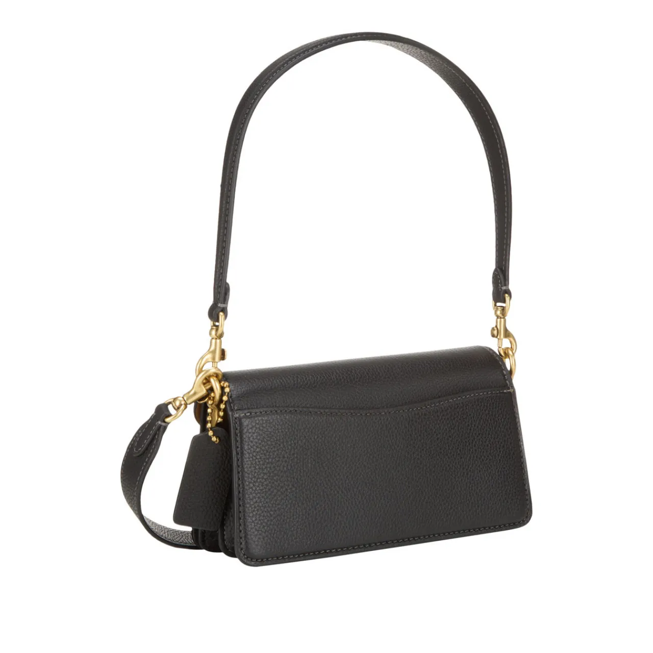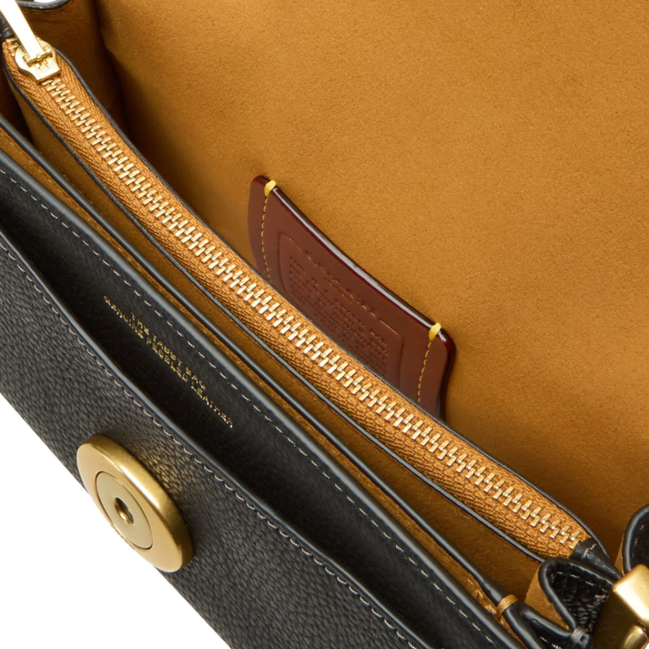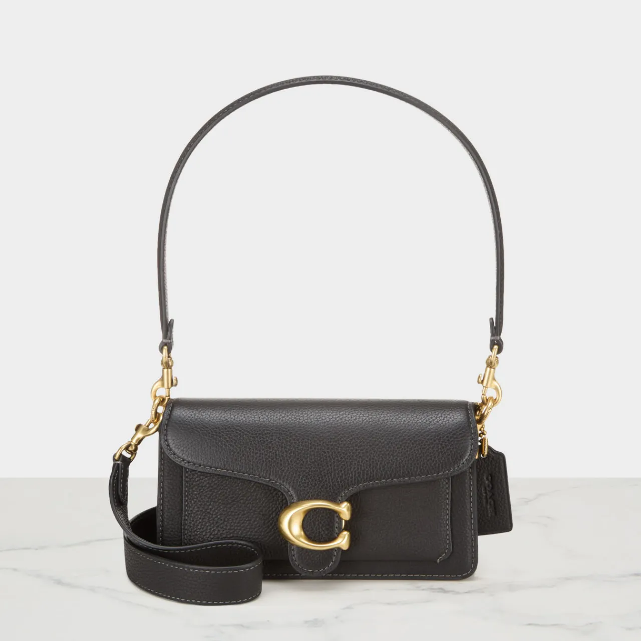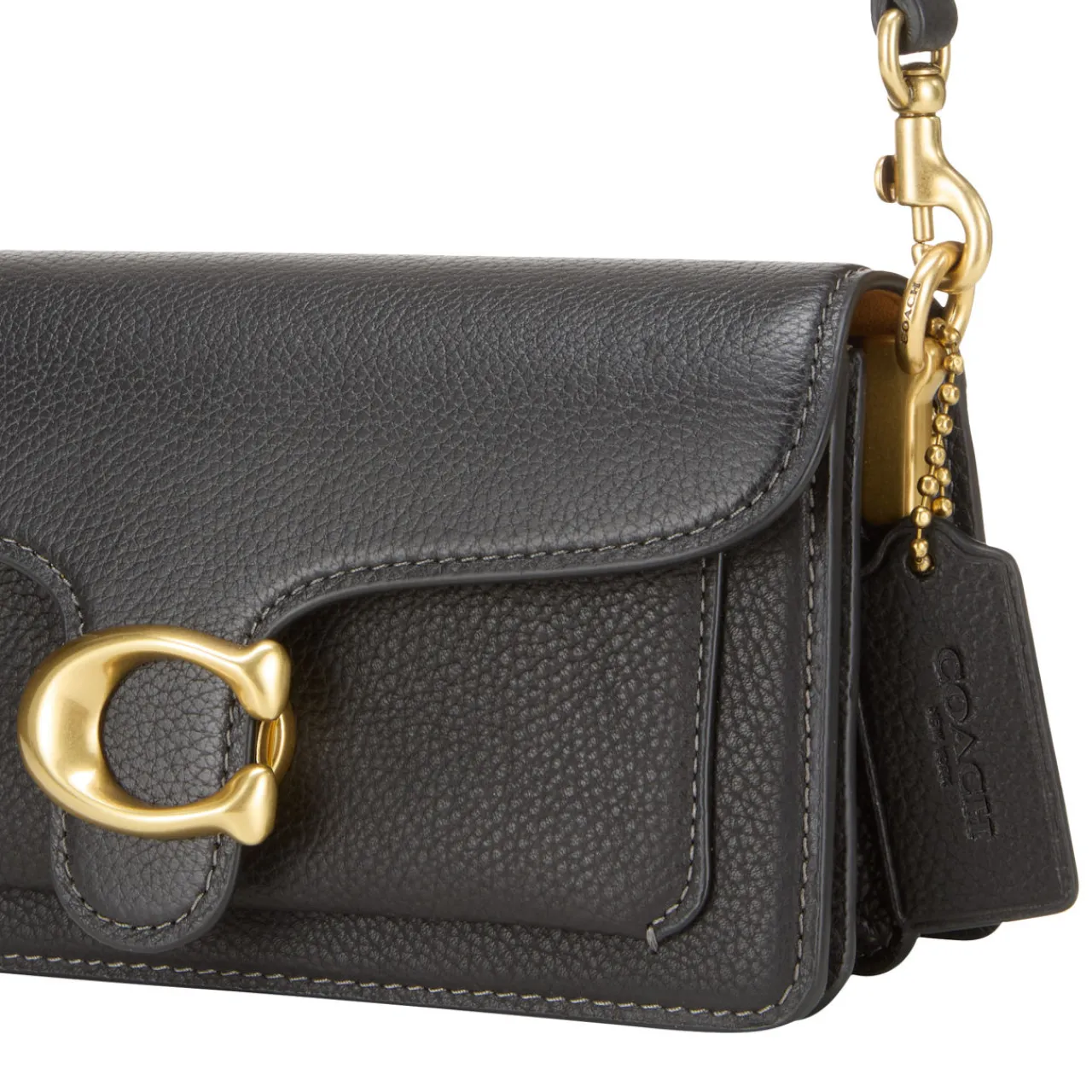 - Flap closure with magnetic snap fastening, detachable shoulder strap, detachable crossbody strap, logo hardware, hanging charm, one exterior slip pocket, gold-tone hardware, pebbled finish
