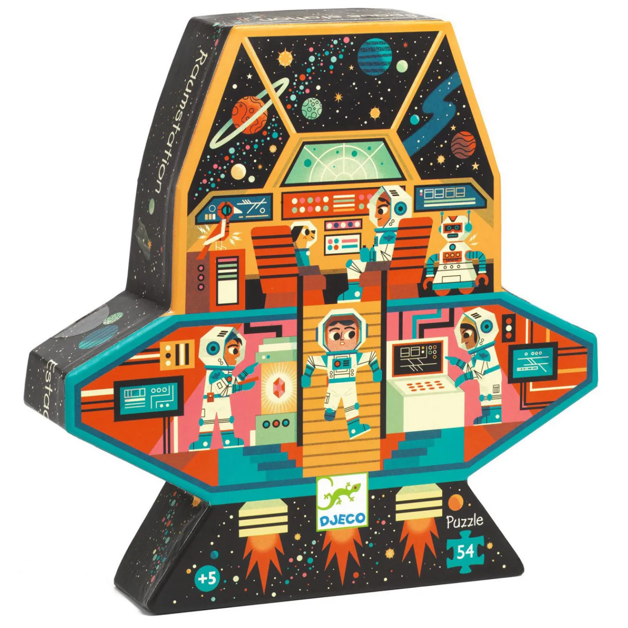 - Space station puzzle in a uniquely shaped box, designed to introduce children to the world of interstellar discovery; Includes: One puzzle made of card, fifty-four pieces
