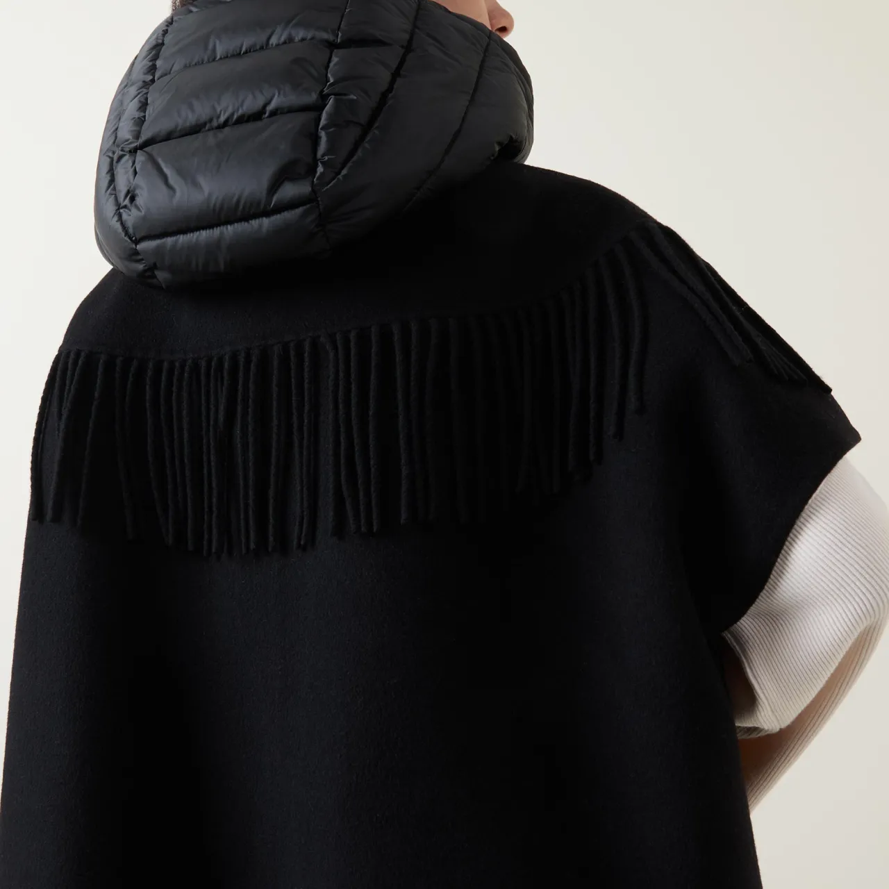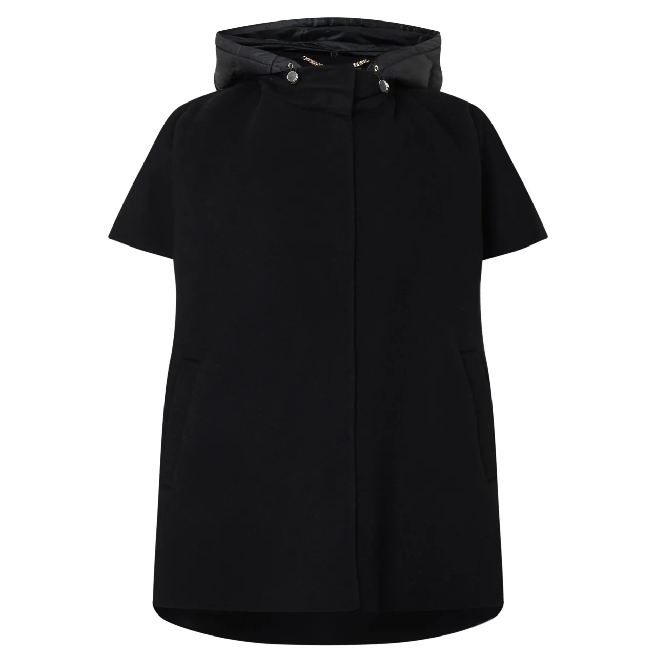 - Padded adjustable hood, short sleeves, concealed fastening, curved hemline, side entry pockets, fringed details