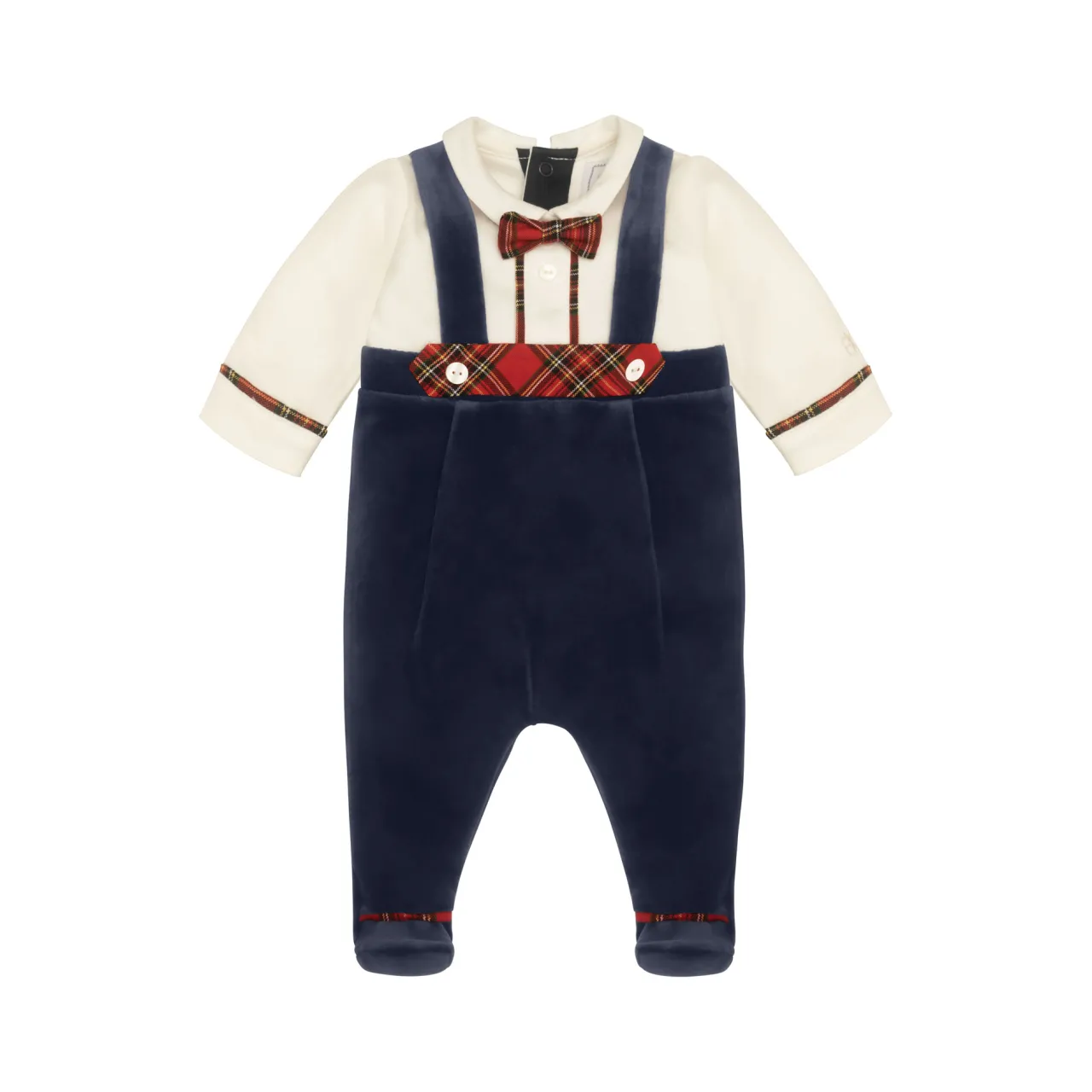 - Collared neckline, bow tie detail, fastening to the back, velour faux trousers, tartan details, long sleeves, enclosed booties