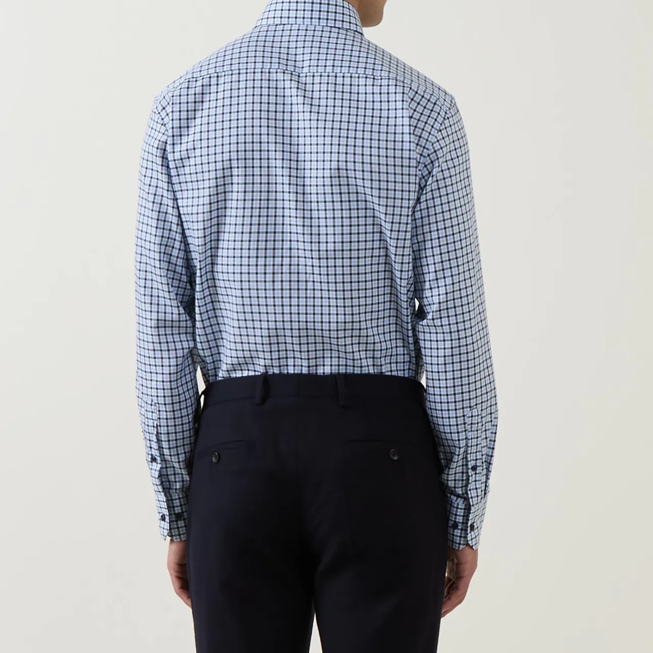 - Button-down collar, long sleeves, button fastenings, single cuffs, check pattern, curved hemline