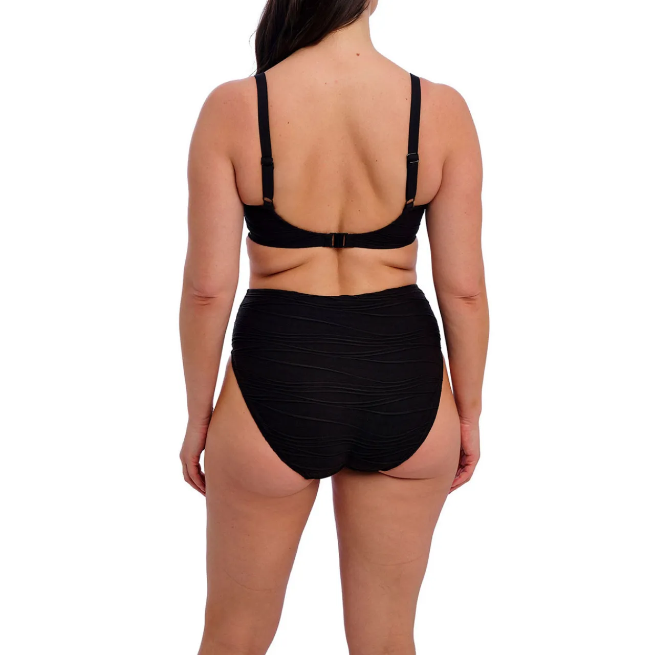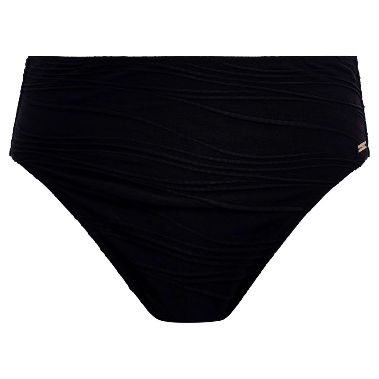 - Soft textured finish, metallic hardware, fully lined, flattering high-rise coverage, high cut leg, branded tab