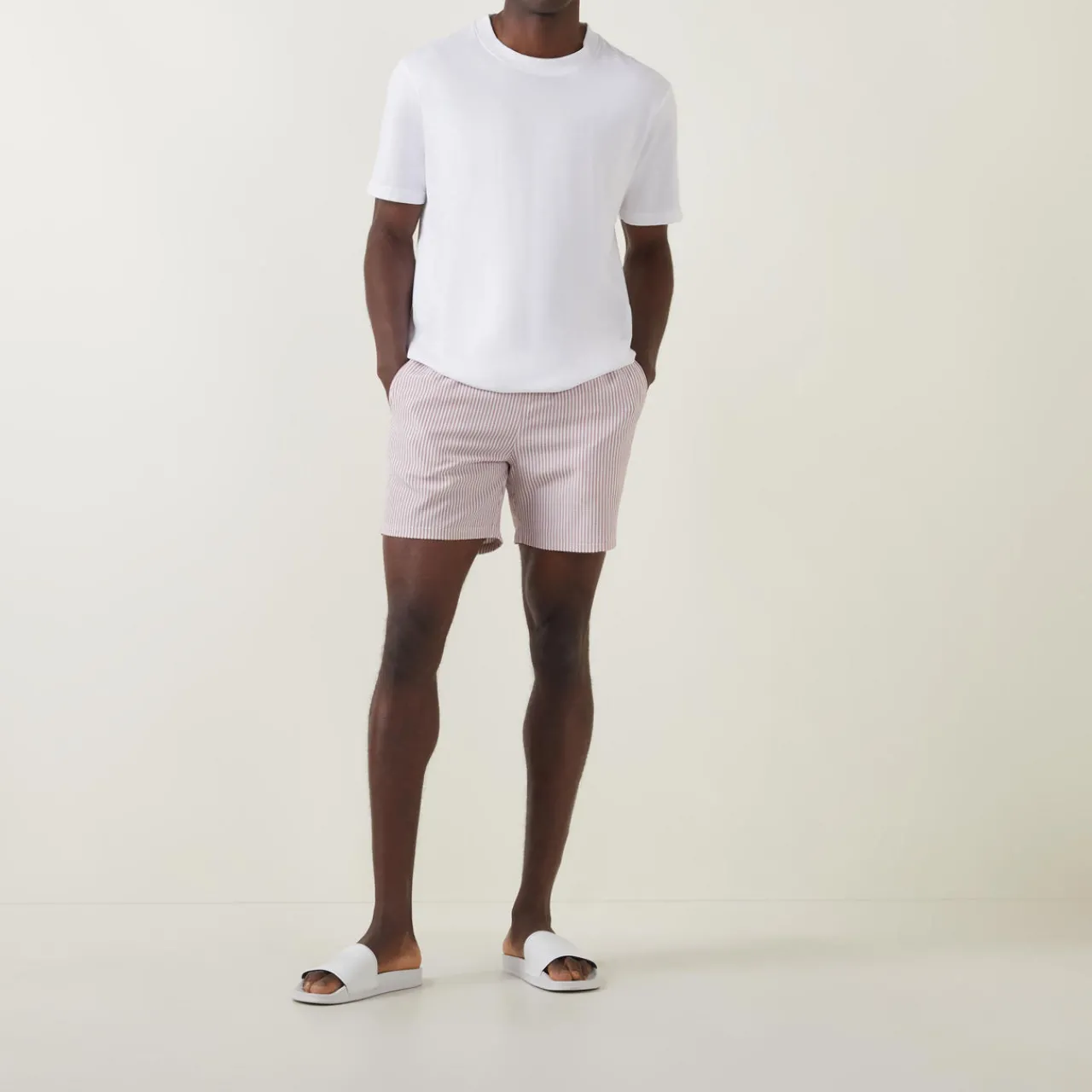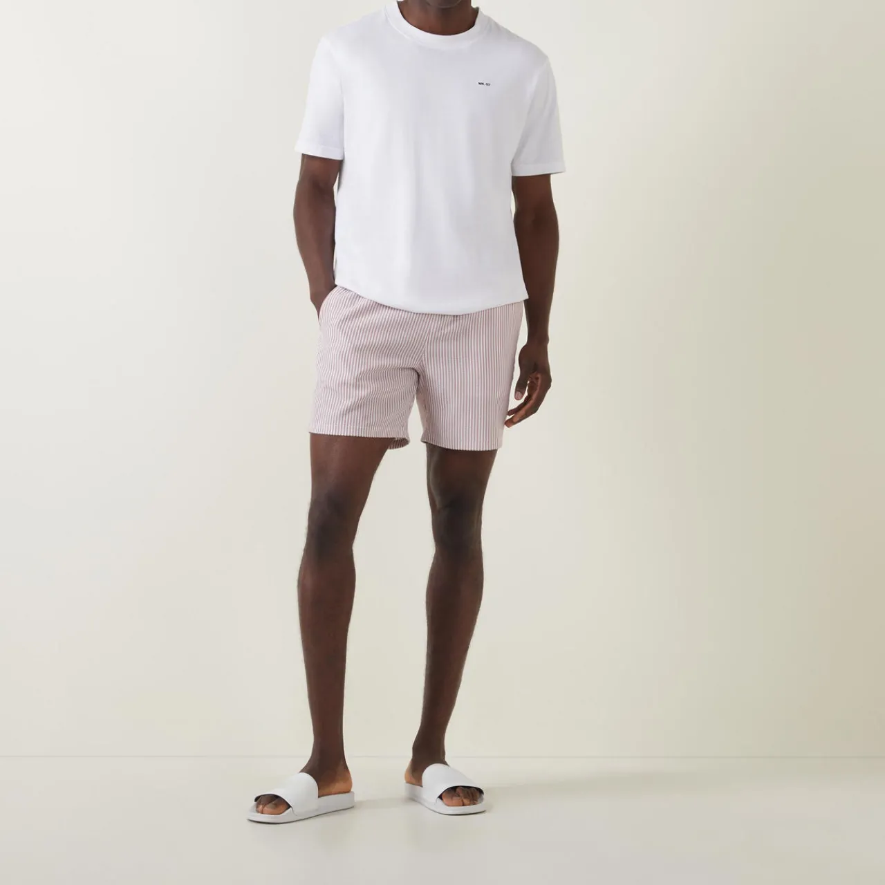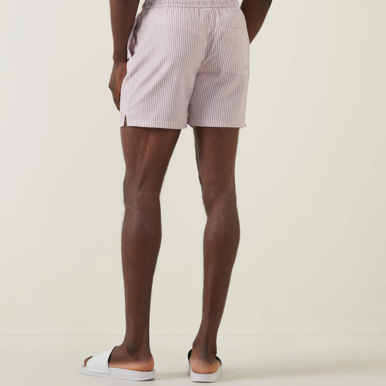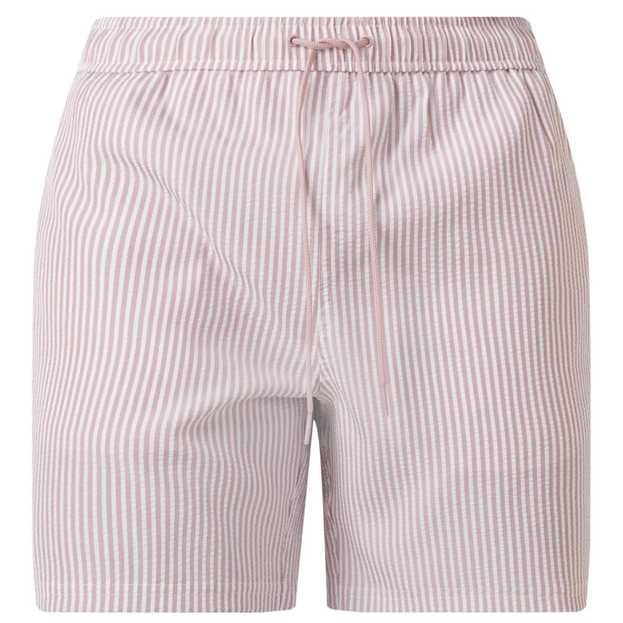 - Elasticated waistband with adjustable drawstring fastening, two side slit pockets, one rear patch pocket, embroidered logo detail, all-over striped design, seersucker textured finish