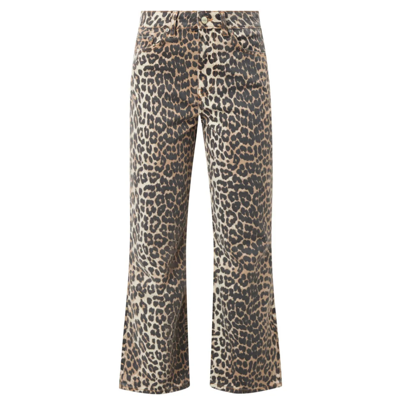 - Leopard print, cropped length, fitted at the waist, hip and thighs, flared leg