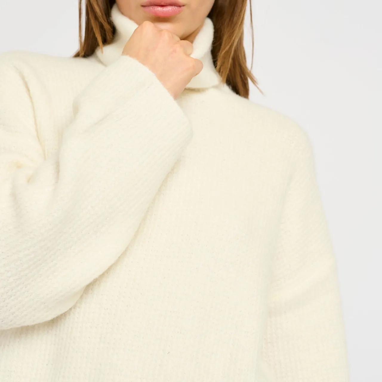 - Roll turtleneck, drop shoulders, ribbed knit design, long wide sleeves