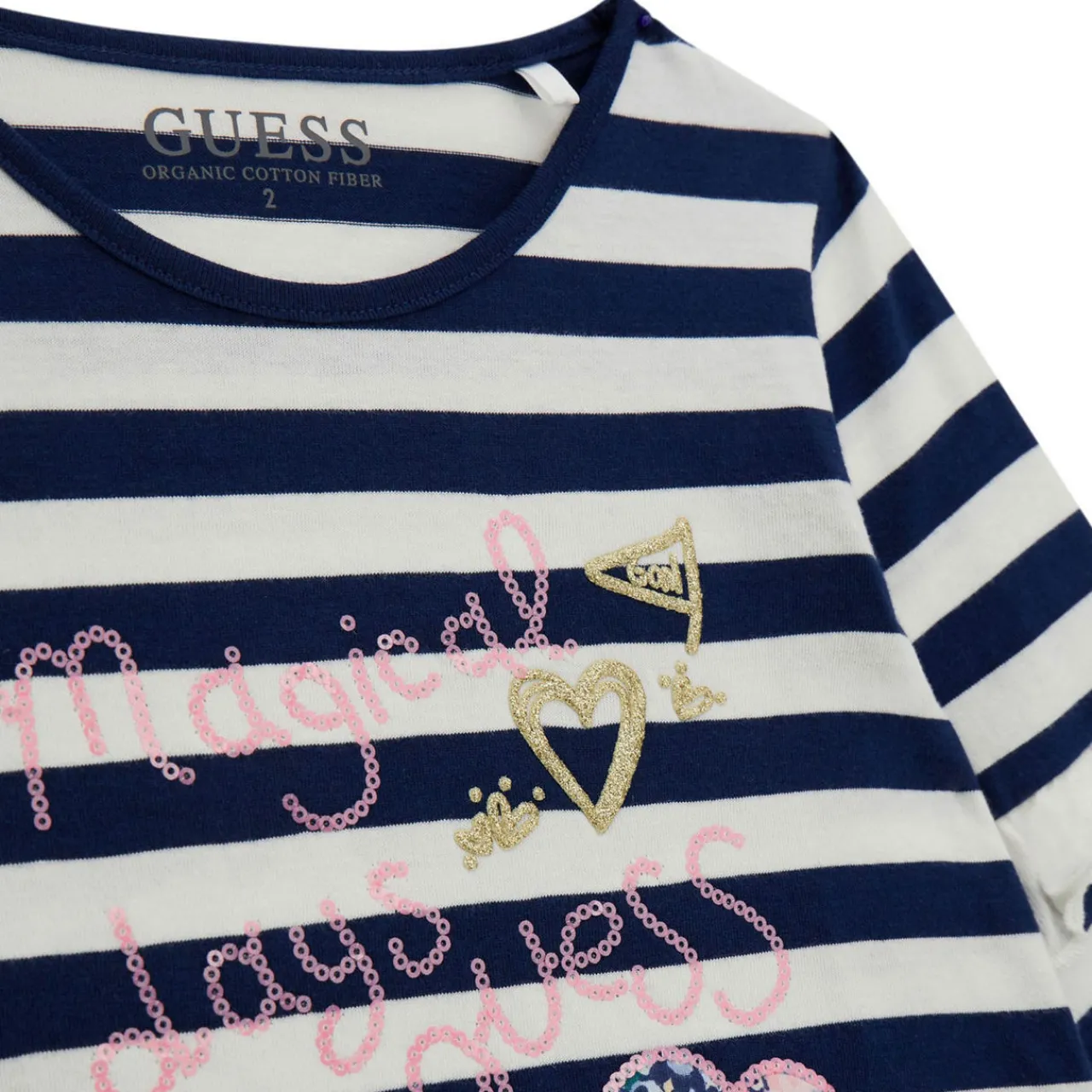 - Round neckline, long sleeves, straight hemline, stripe pattern, sequin logo slogan, ruffle details