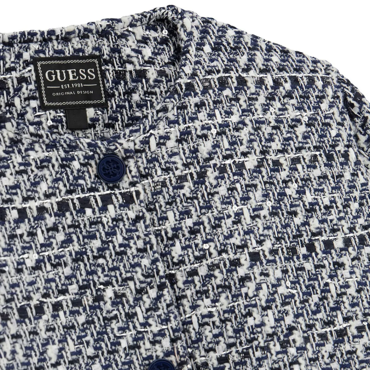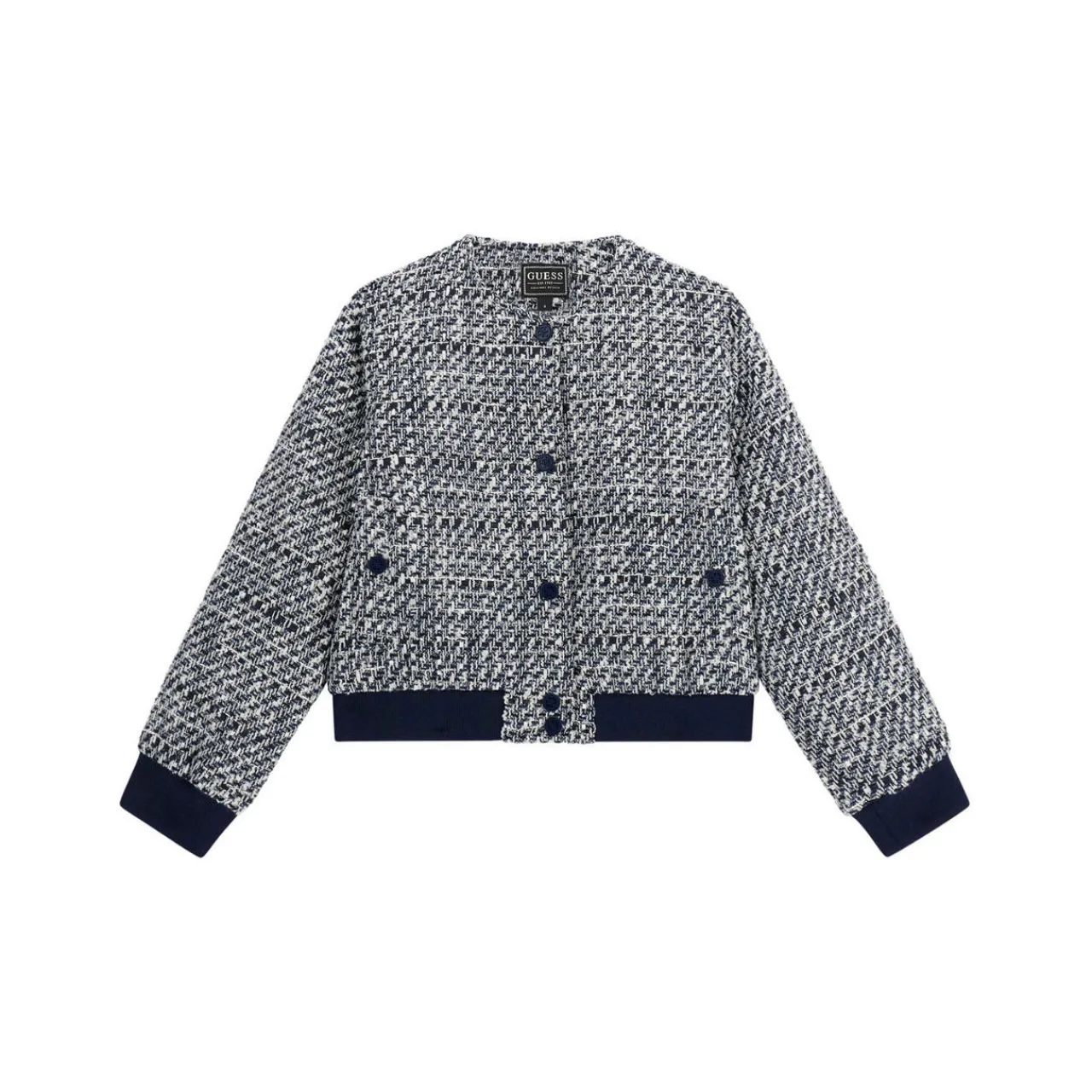 - Tweed pattern, long sleeves, round neckline, collarless, front button fastening, buttoned pocket detail