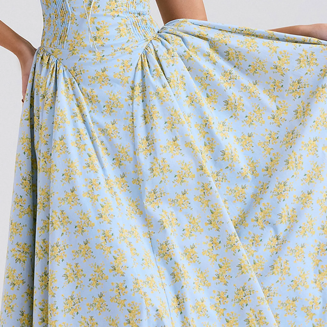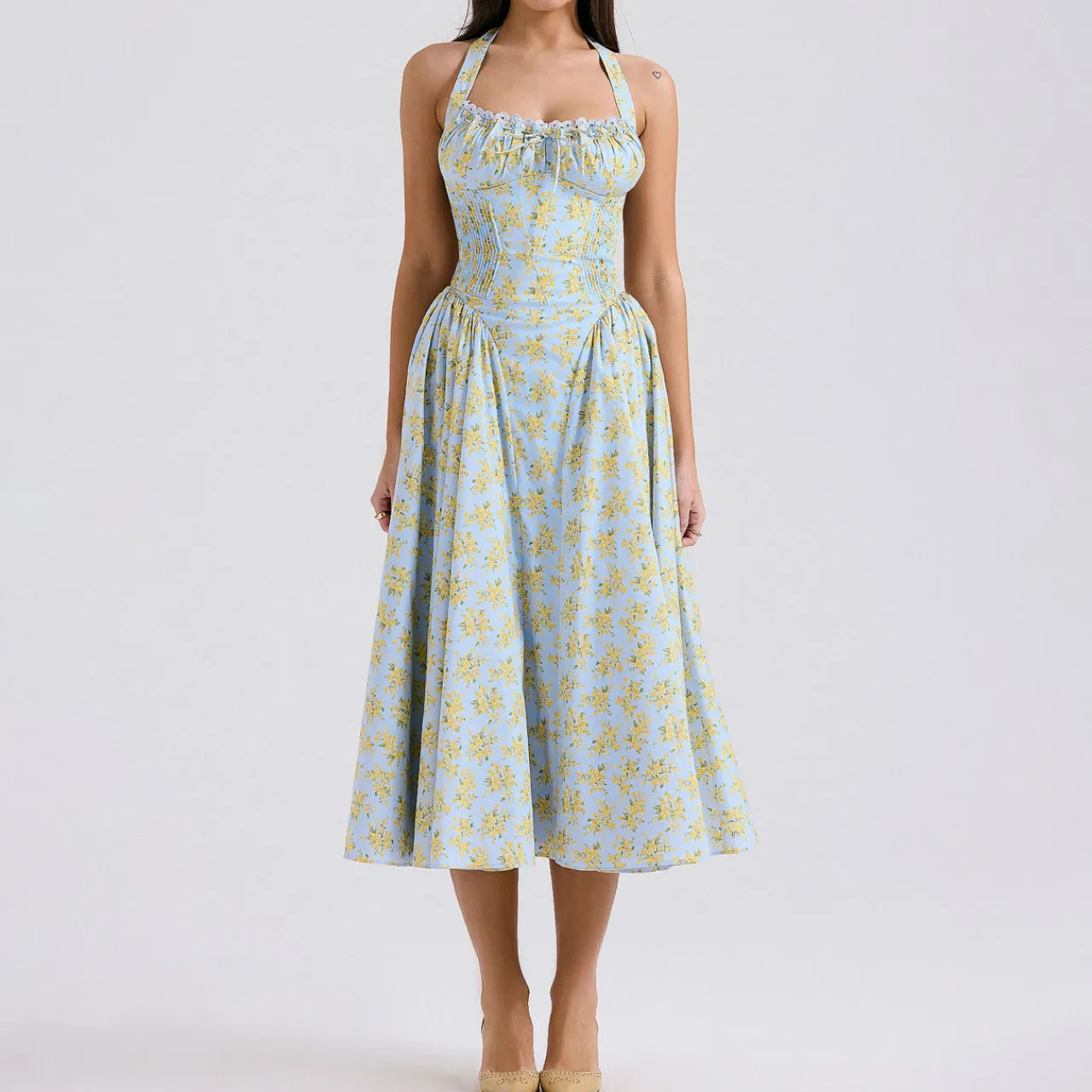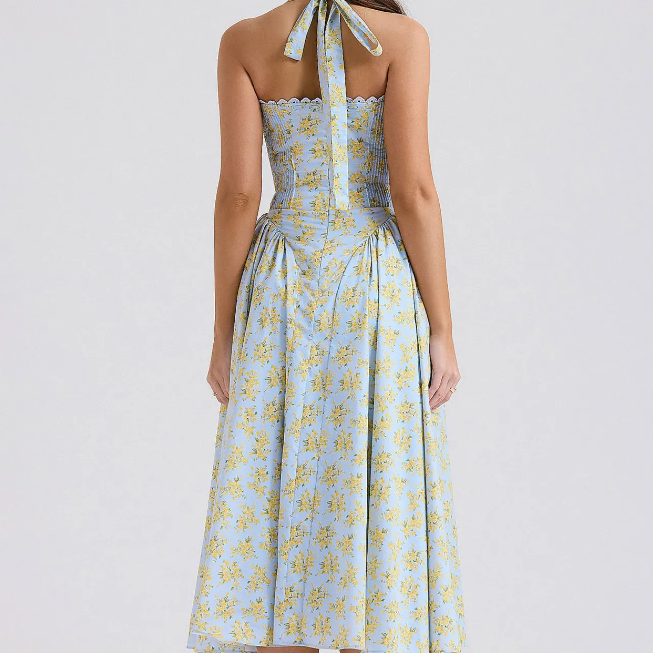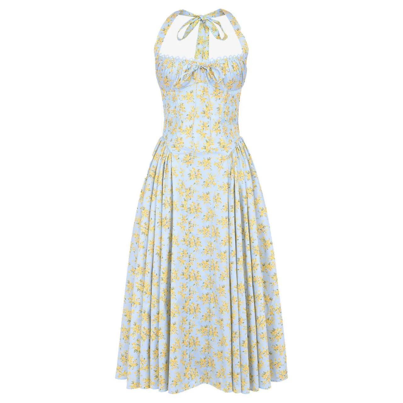 - Midi length, sundress, floral print, stretch-fused fabric, gathered bustier neckline, wide self-tie halter straps, fitted bodice