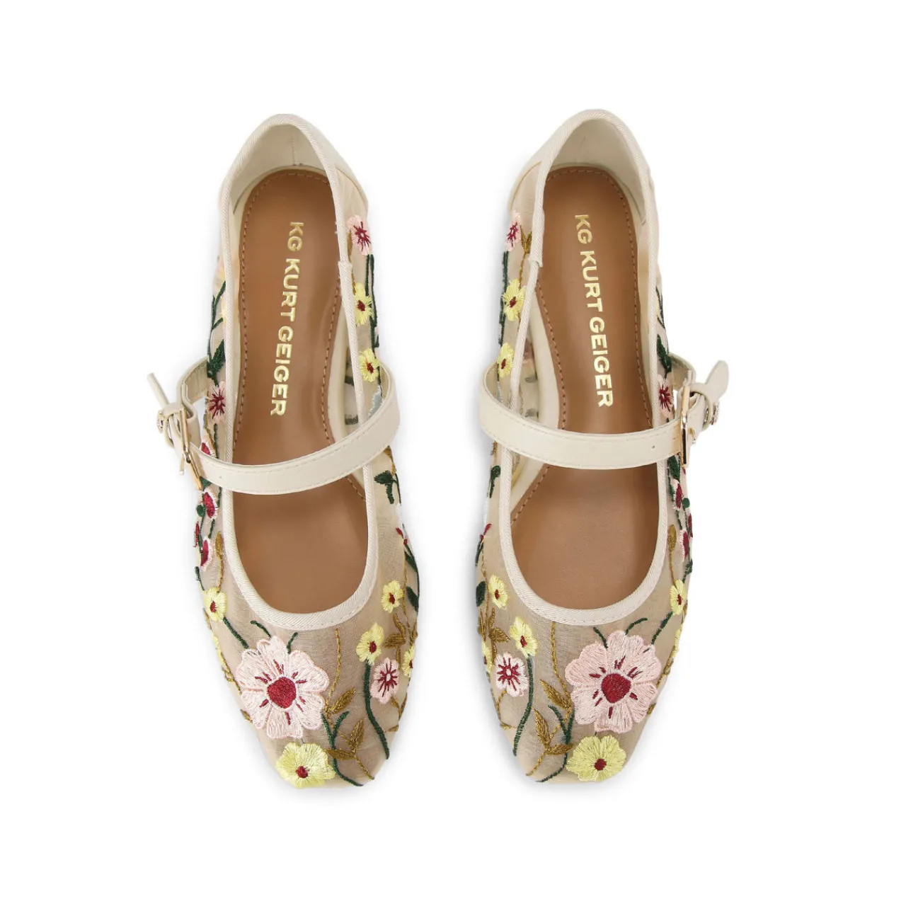 - Mesh upper, floral stitching, foot strap, gold-tone buckle fastening