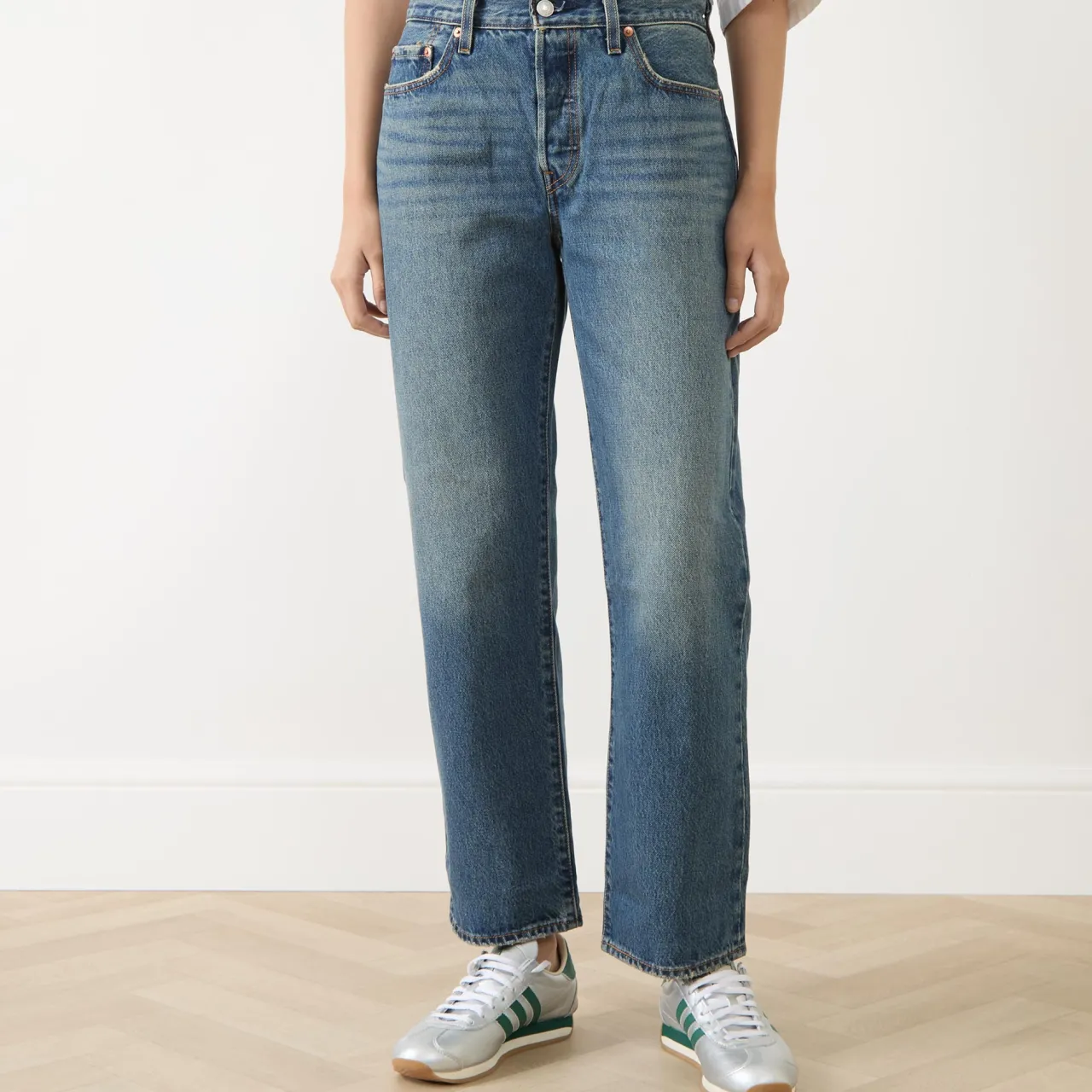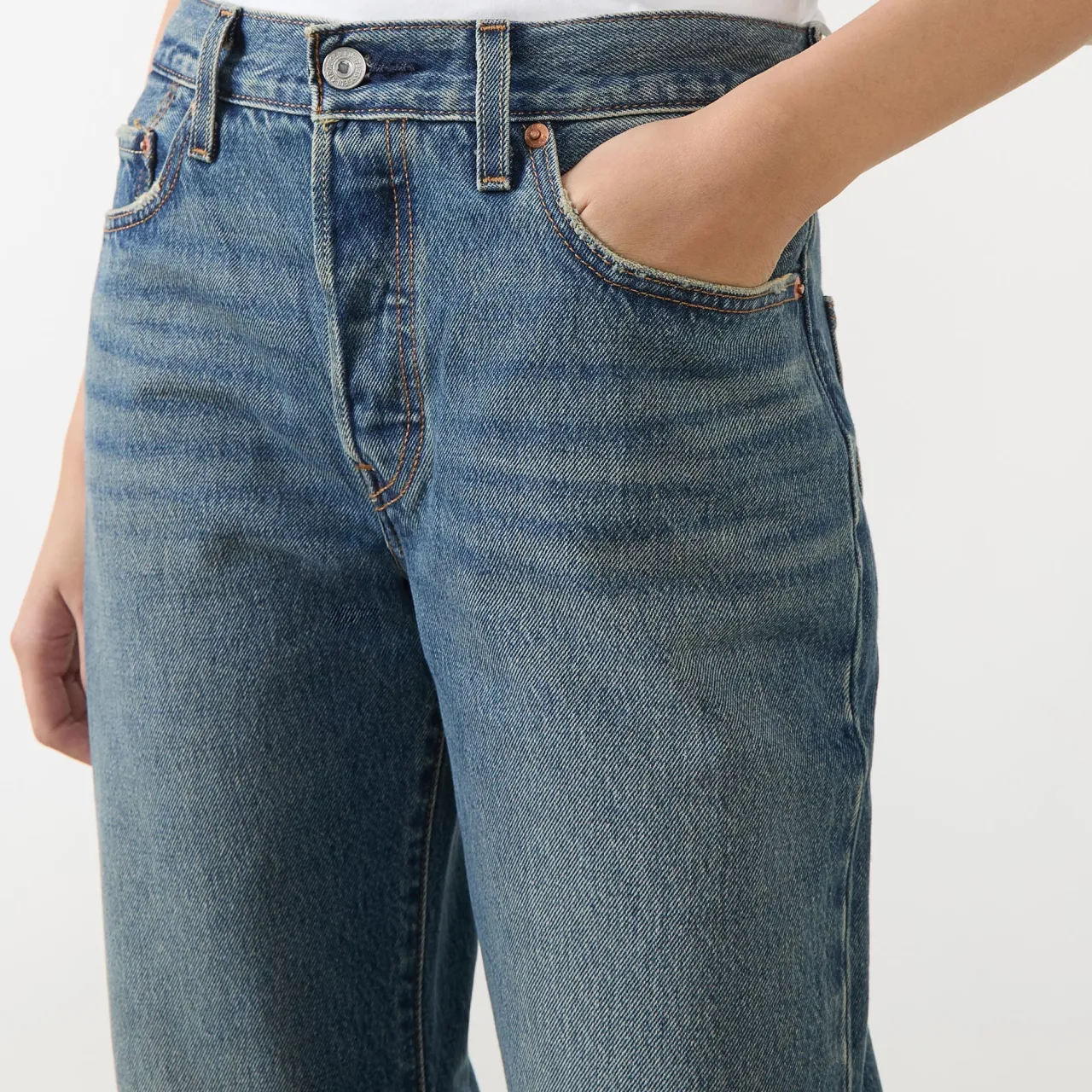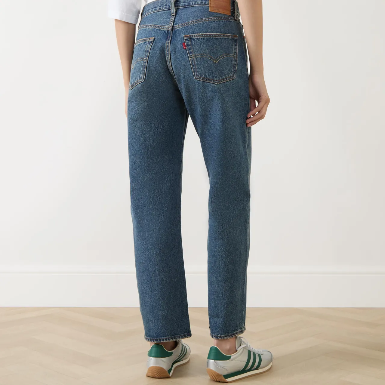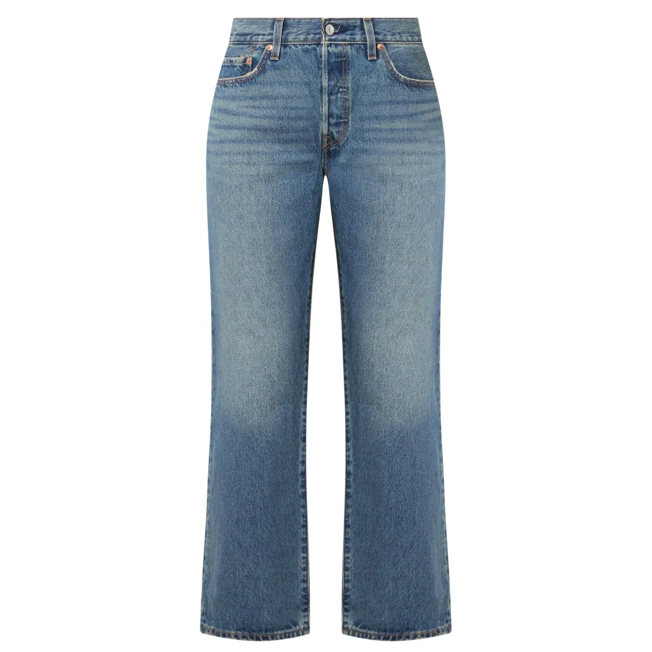 - Button and fly zip fastening, belt loops, five-pocket style, straight-cut legs, faded and whiskering details, logo badge and tab embellishment, non-stretch denim