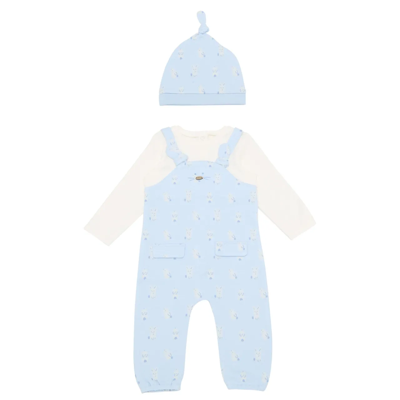 - Two-piece set, long sleeves, bunny motif, includes a matching hat, snap buttons