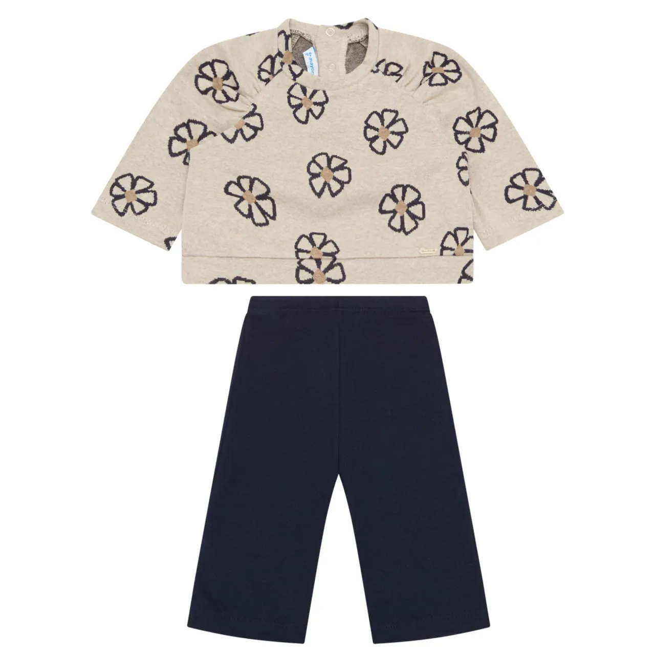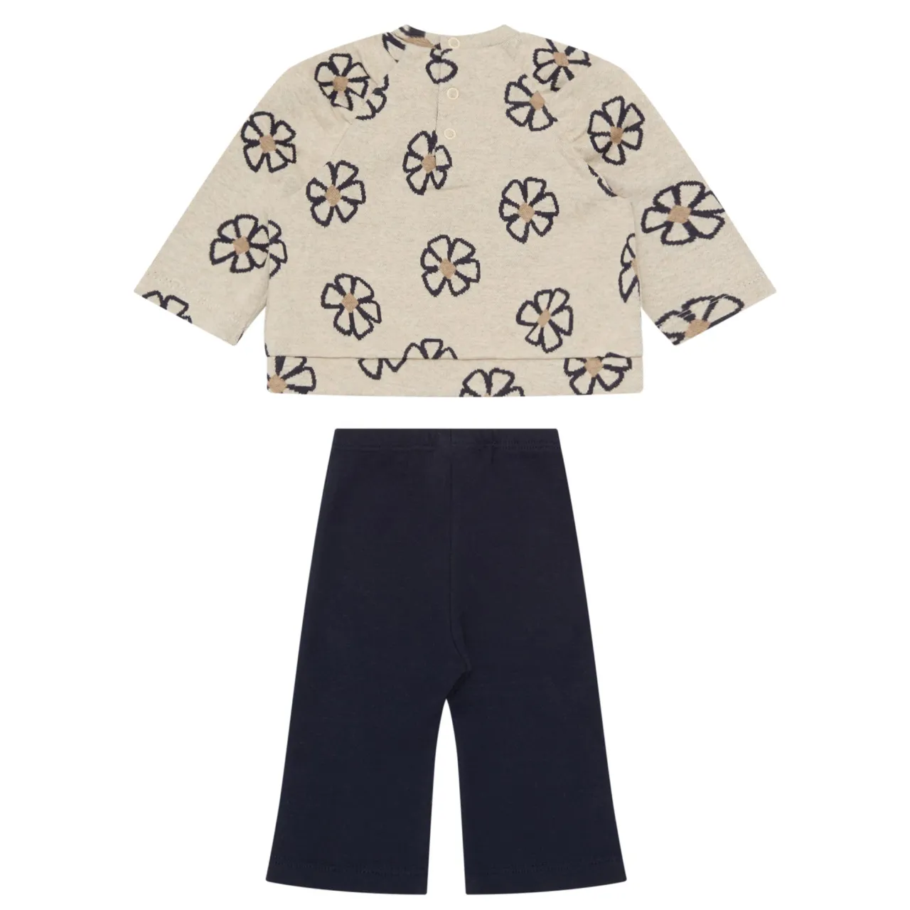 - Two-piece set. Sweatshirt: Long sleeves, floral motif, round neck, snap buttons. Trousers: elasticated waist
