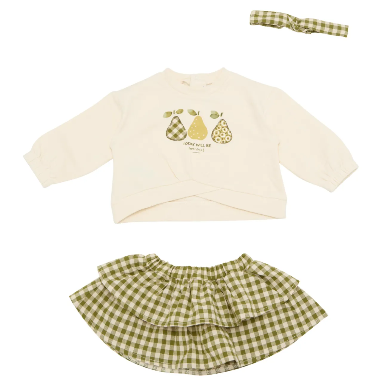 - Three-piece set. Skirt: Tiered design, gingham pattern, elasticated waist. Sweatshirt: Pear motif, round neck, long sleeves. Includes matching bow