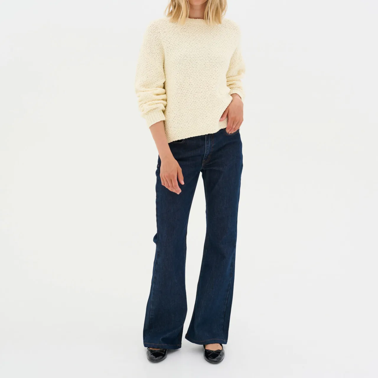 - Crew neck, dropped shoulders, long sleeves, straight hem, subtle open-knit design