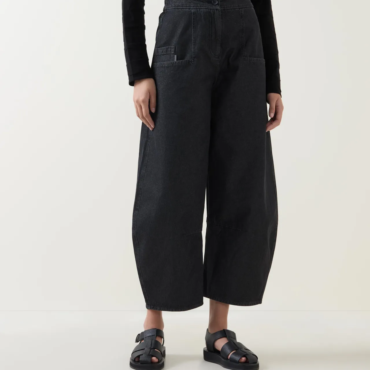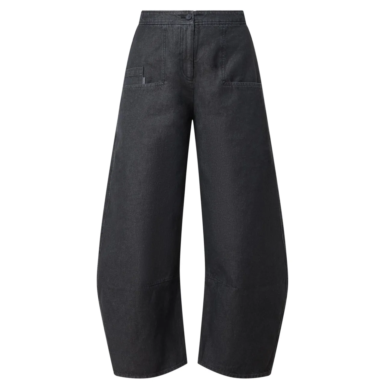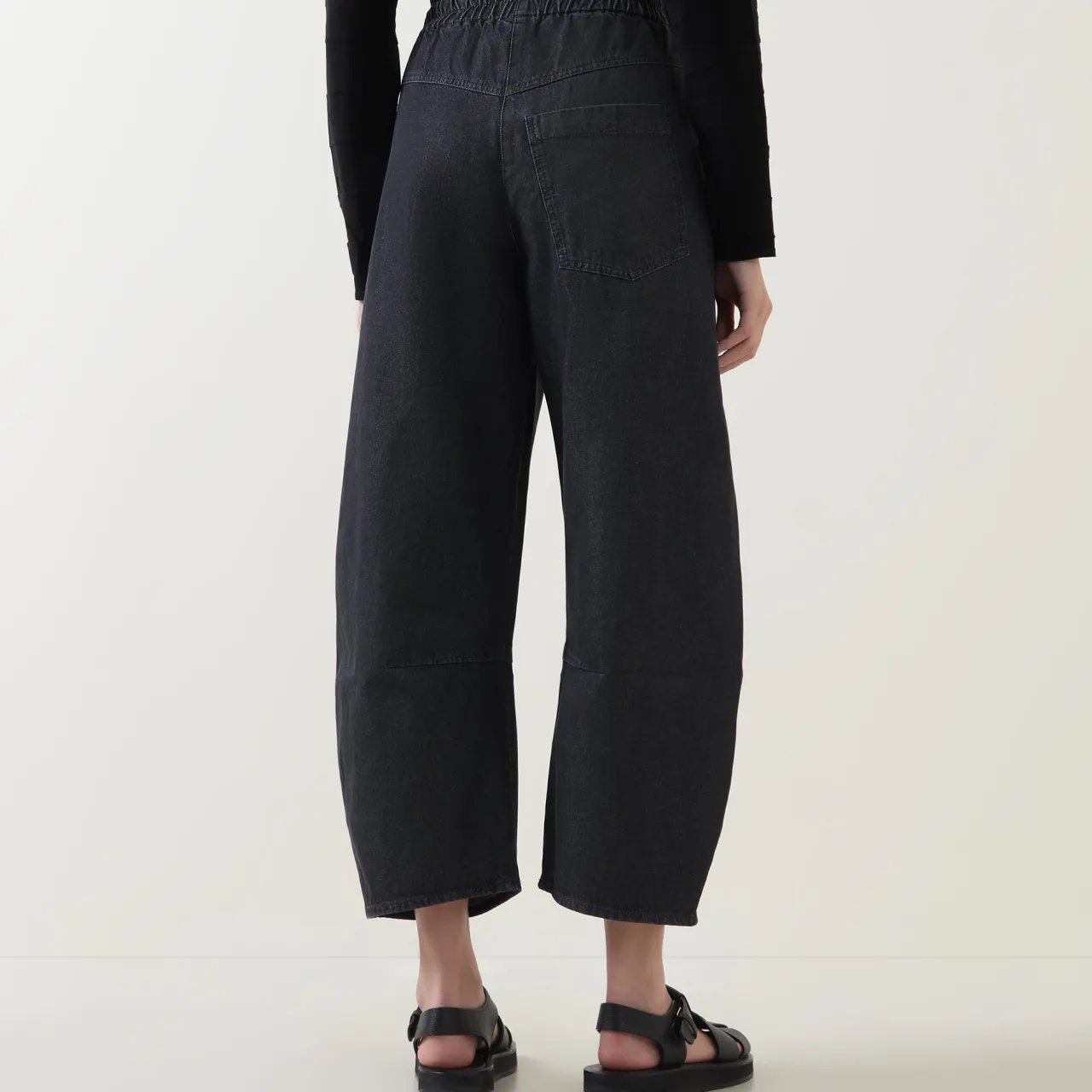 - Zip-fly and button fastening, elasticated back panel, two side patch pockets, one rear patch pocket, tonal stitching, high-rise, barrel-cut leg, smooth fabric
