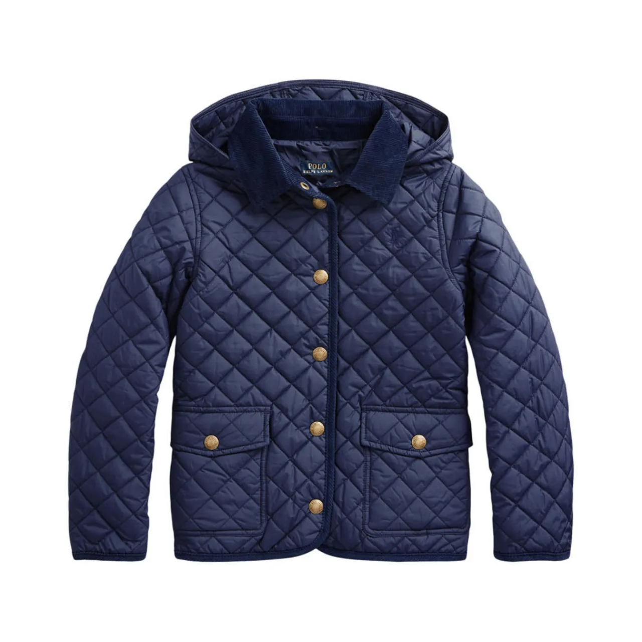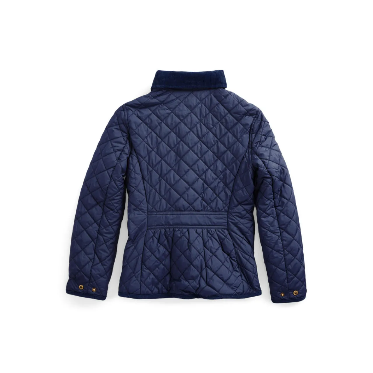 - Water-repellent shell, lightweight fill, corduroy trim, signature embroidered Pony logo, corduroy point collar, button-off hood, snapped placket, long sleeves, snapped cuffs, two front waist snapped pockets, princess seams at the back, shirred back waist, signature name tag label at the interior, fully lined, filled