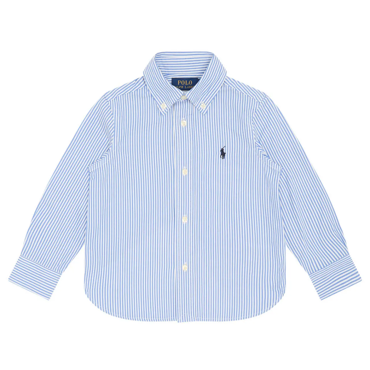 - Button-down collar, button fastening, curved hemline, stripe print, embroidered logo detail, box pleat at rear