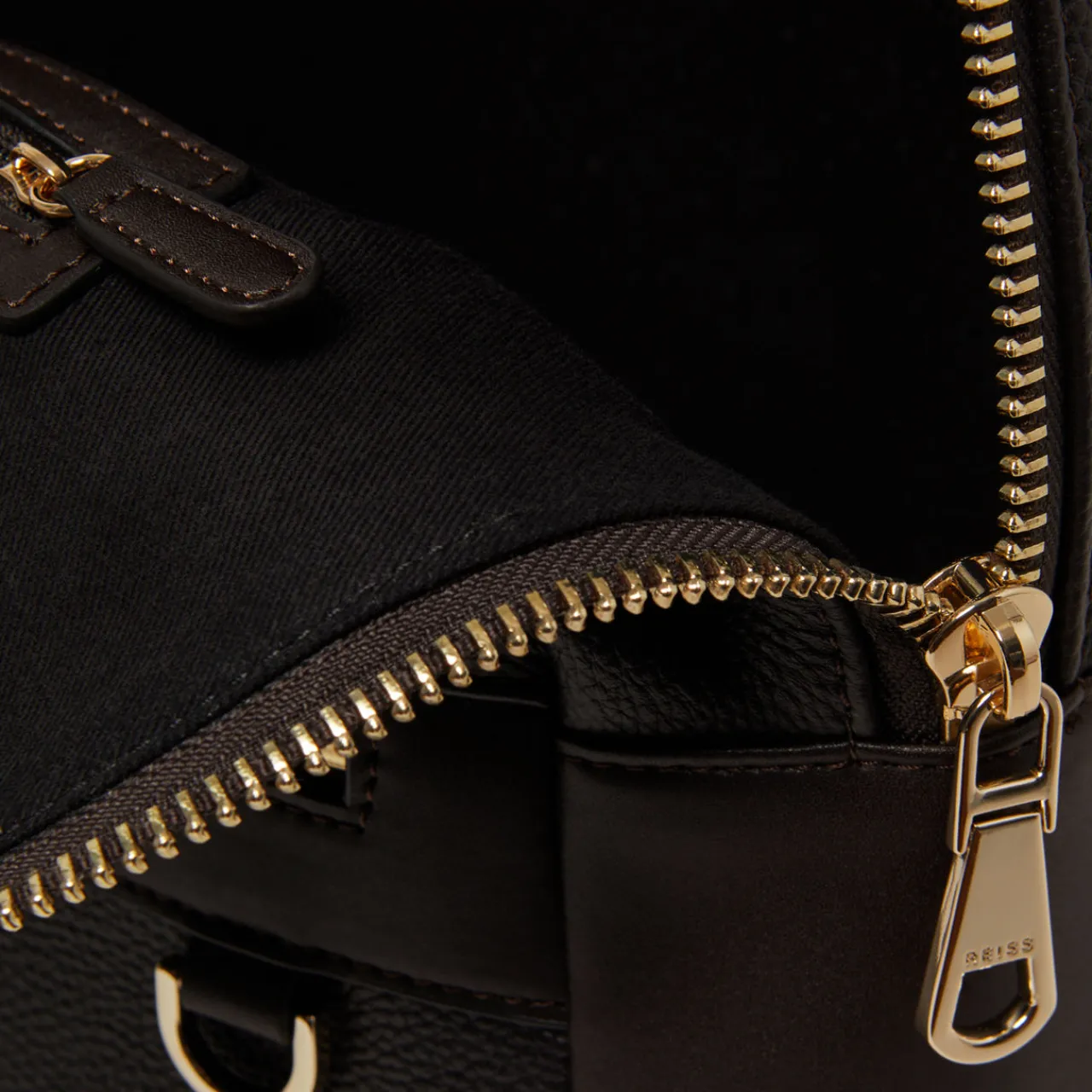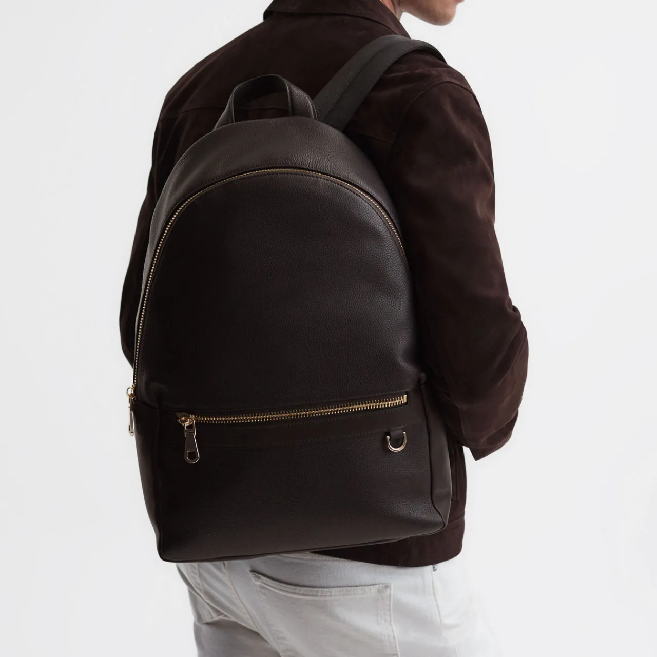 - Leather construction, mesh back panel, top zip fastening, zipped front pocket, carry loop, adjustable shoulder straps, gold-tone hardware, cotton lining