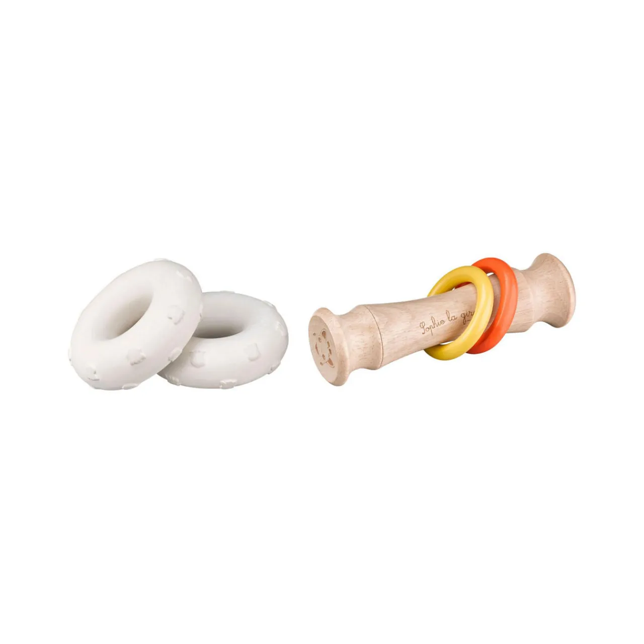 - Wood and rubber teething toy.