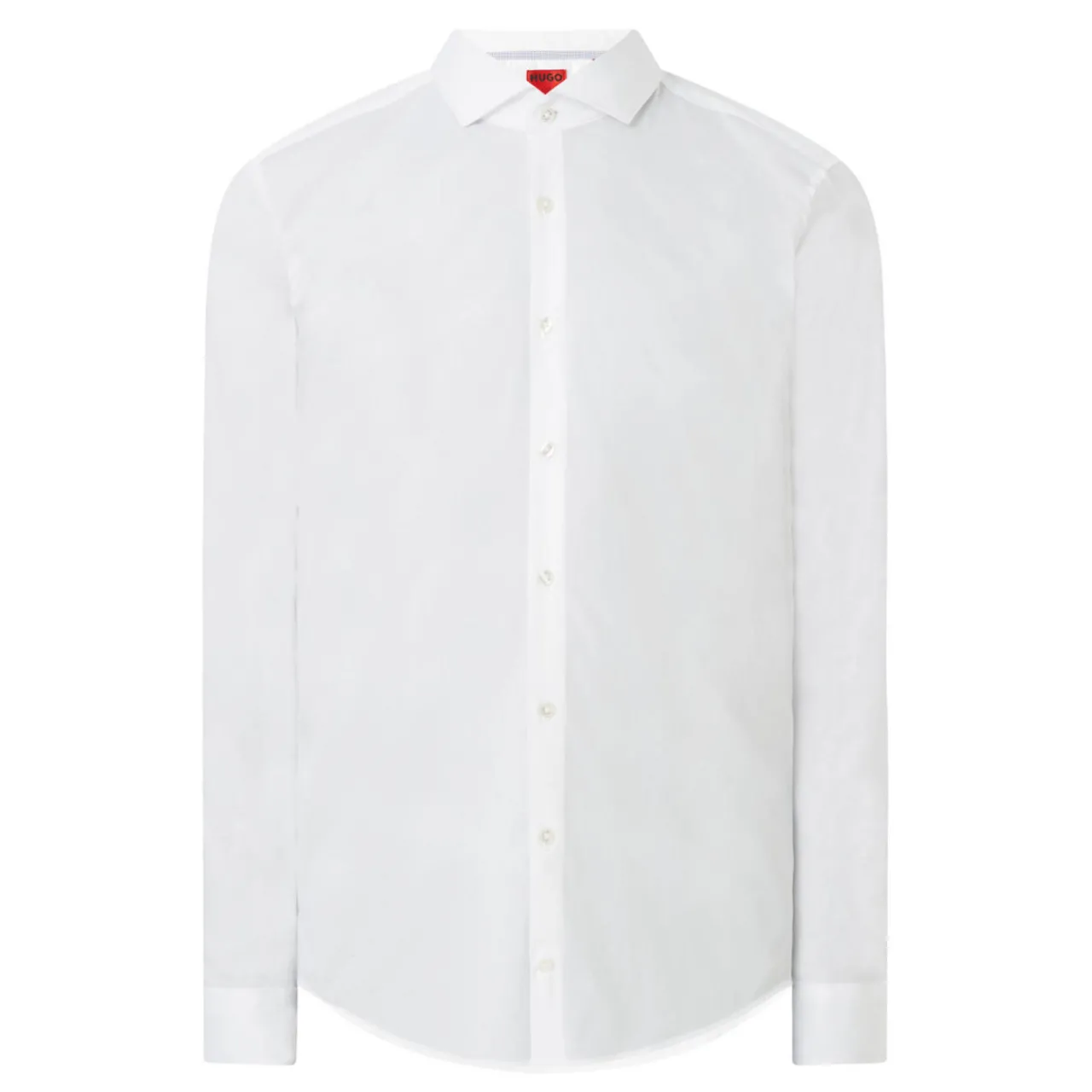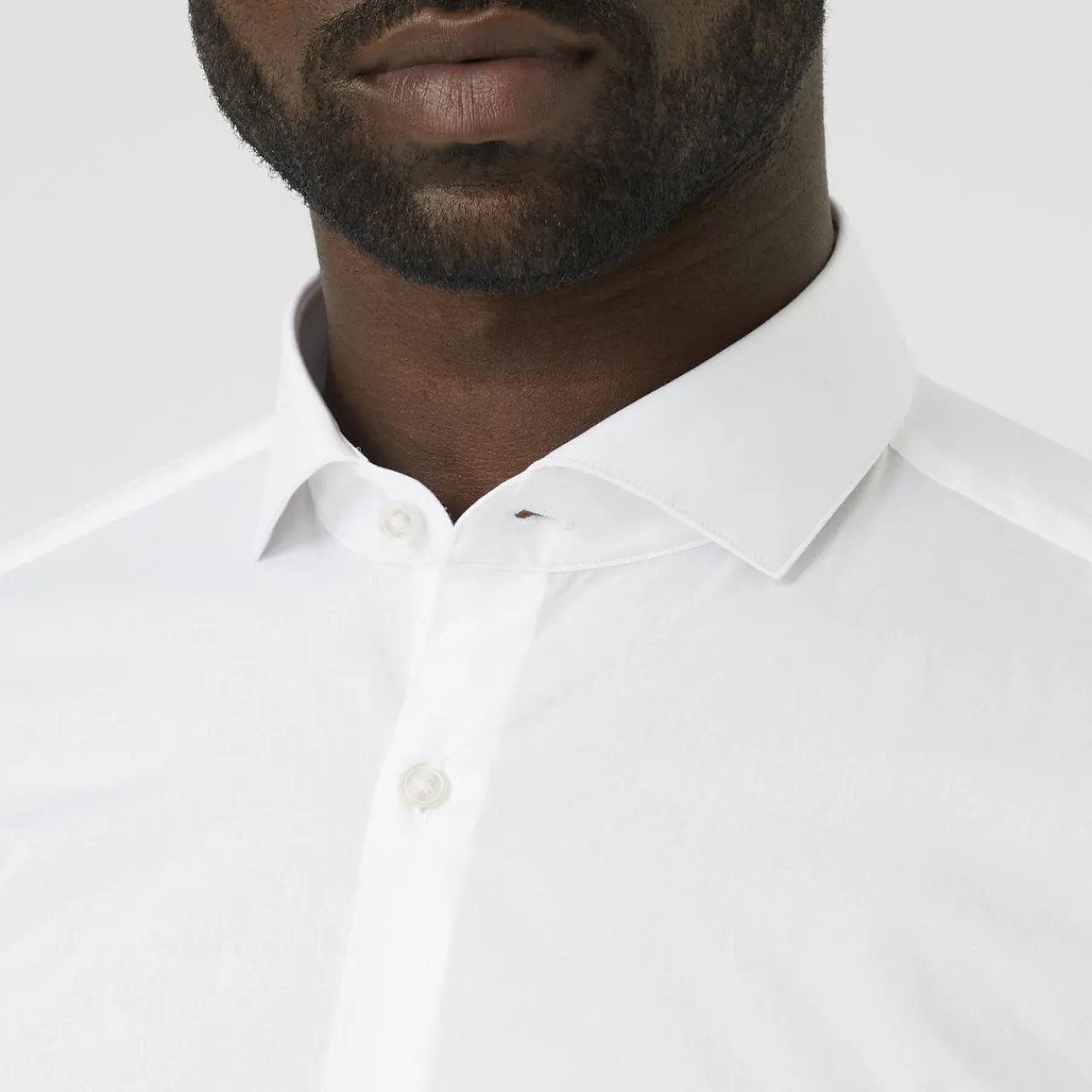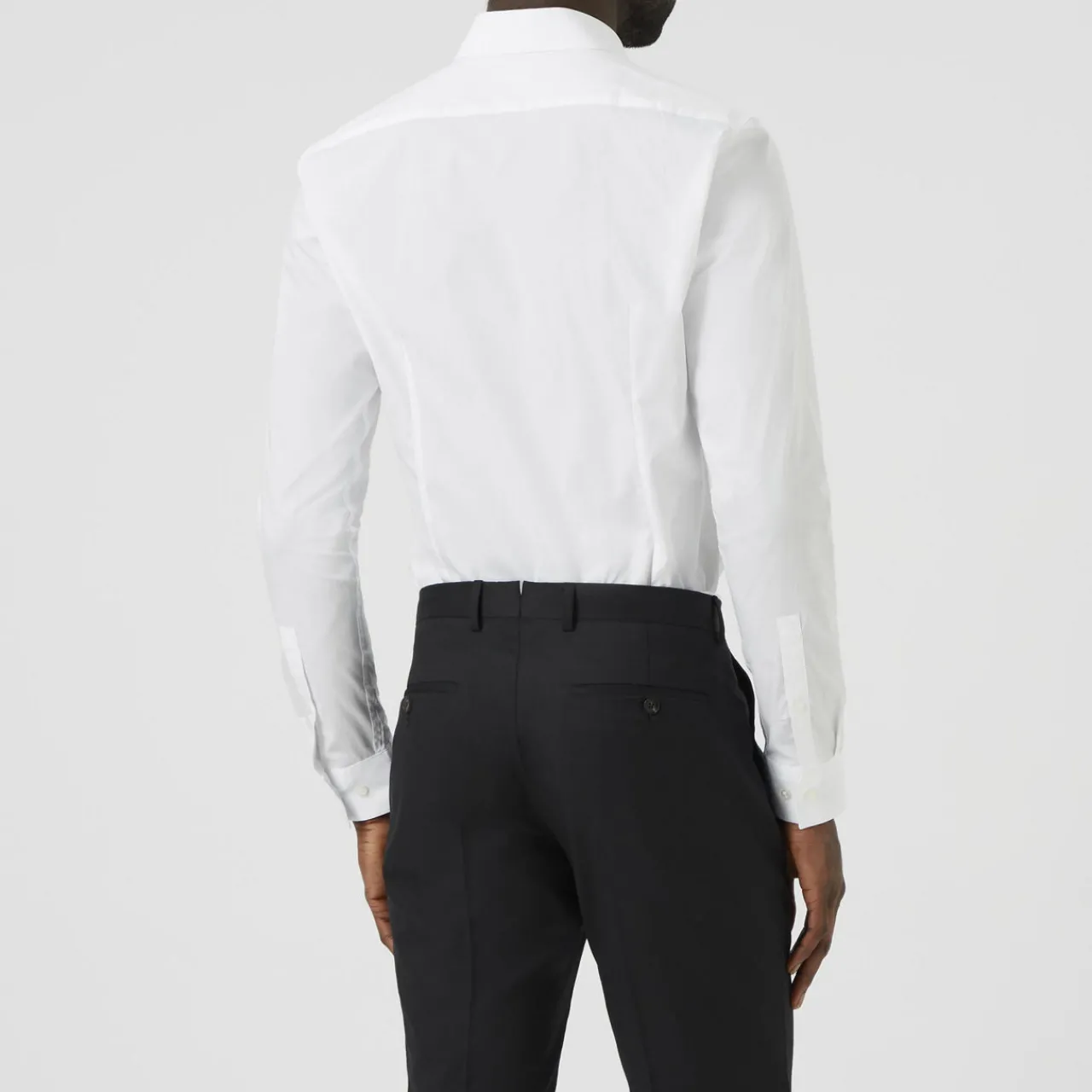 - Long sleeves, pointed collar, button fastenings, structured cuffs