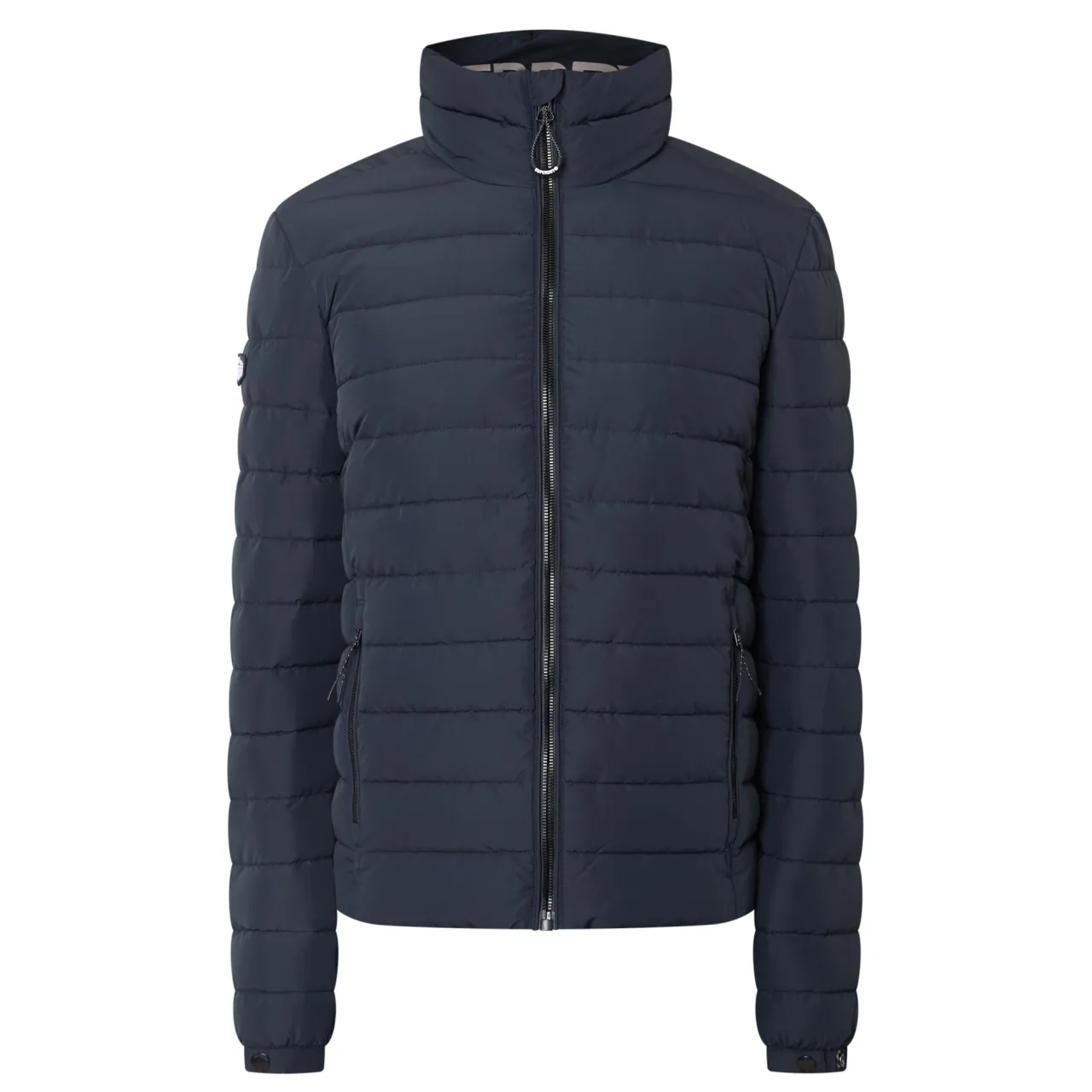 - Funnel neckline with logo lining, zip fastening, long sleeves, elasticated cuffs with snap button adjustable fit, zipped side entry pockets, bungee cord adjustable hemline, fully lined, internal mesh pocket, logo badge, padded