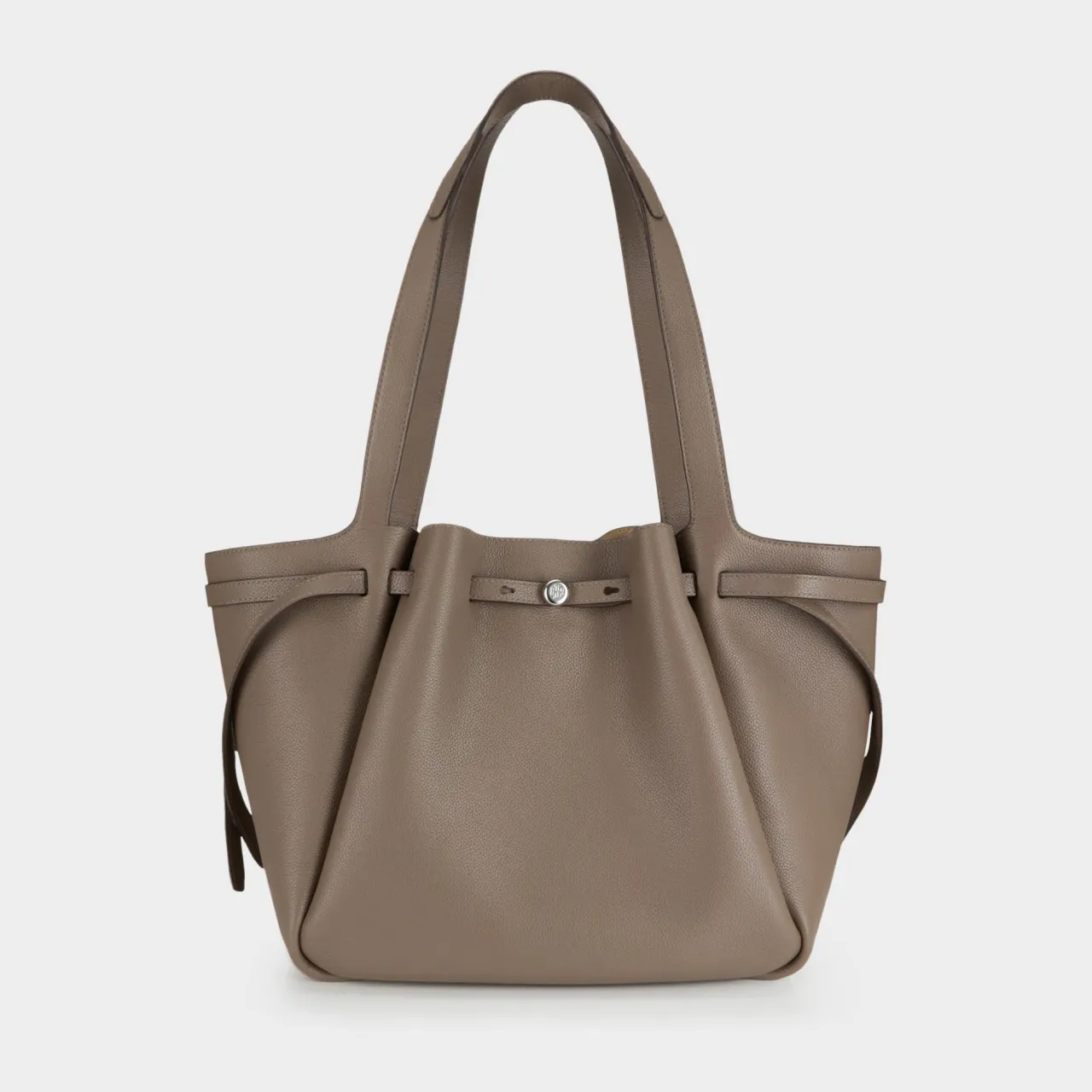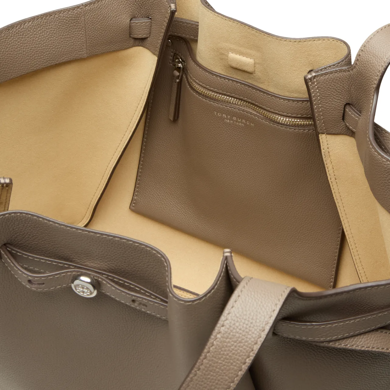 - Top carry handles, magnetic snap closure, silver-tone hardware, belt with tab adjustable sides, grained finish, logo details