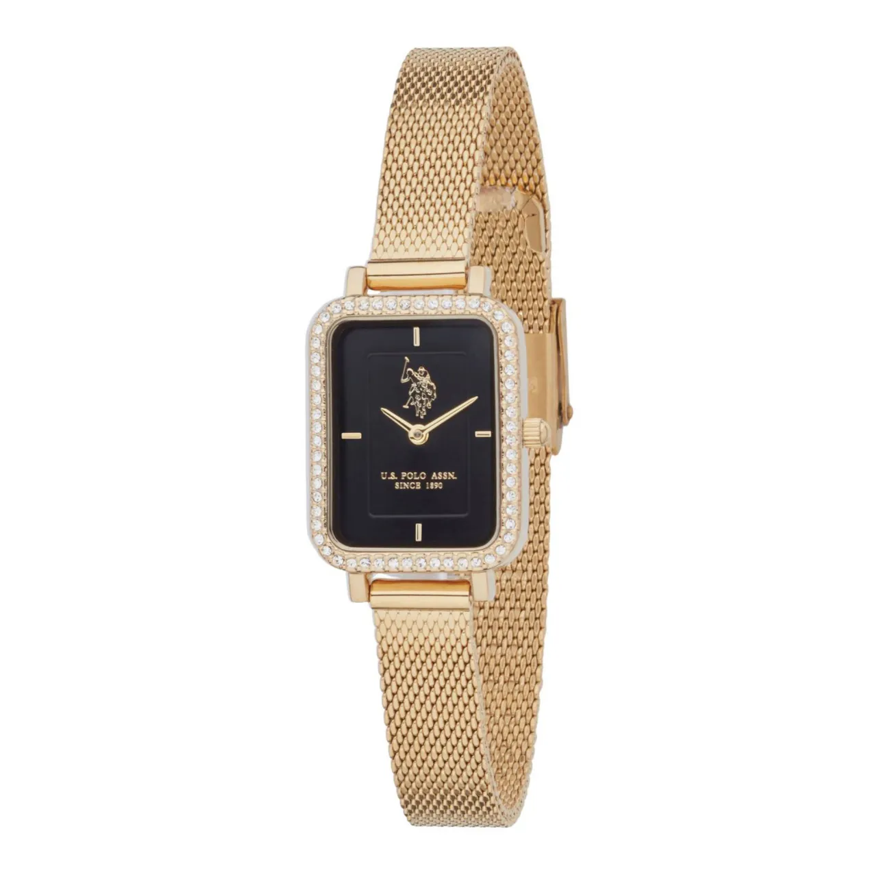 - Gold-tone rectangular case, gold-tone mesh bracelet, black dial, gold-tone baton hour markers and hands, brand logo details, adjustable fit, bezel with crystal embellishment, quartz movement, two hands movement type