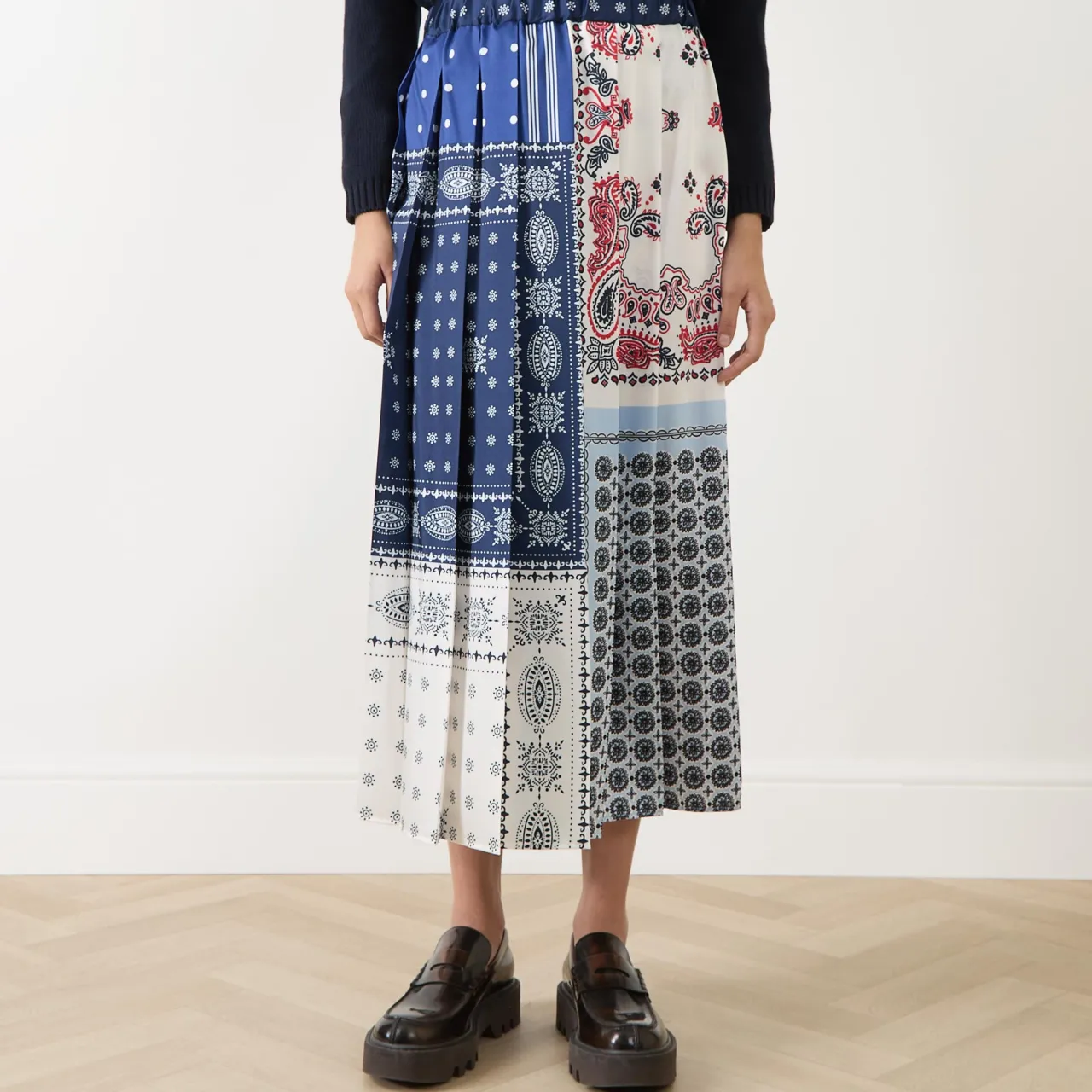 - Midi length, pleated, bandana print, elasticated waistband, unlined