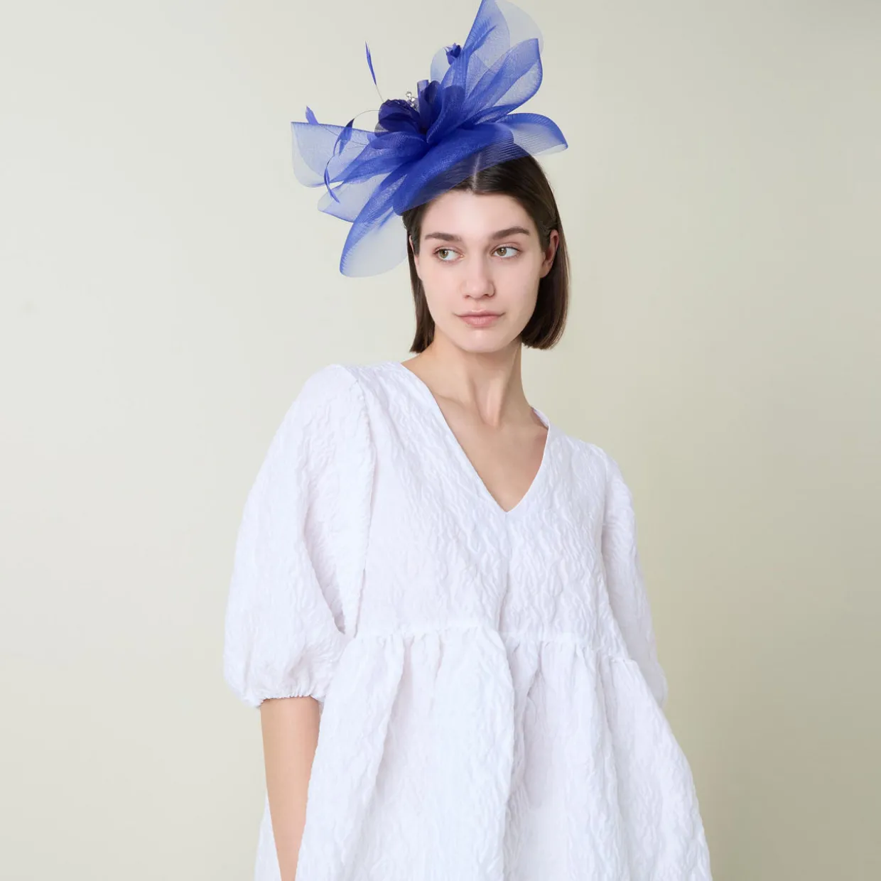 - Disc shaped fascinator, set on a thin headband, embellished detailing, bow design with feather accents, mesh finish