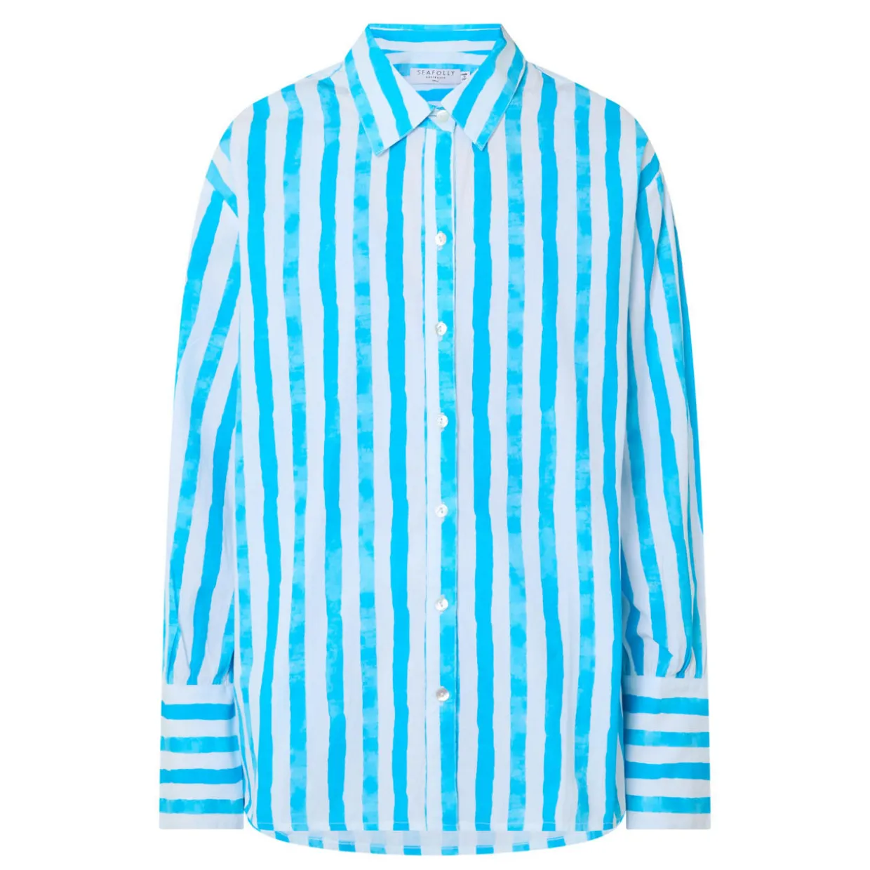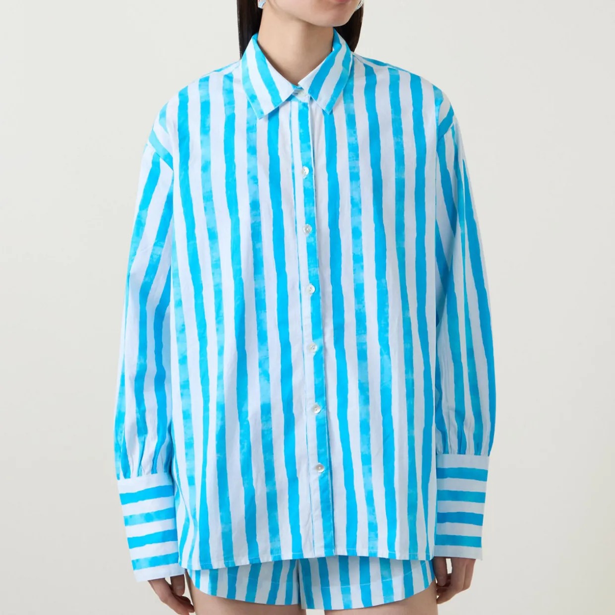 - Point collar, long sleeves, extended buttoned cuffs, front button fastening, curved hem, striped design, lightweight