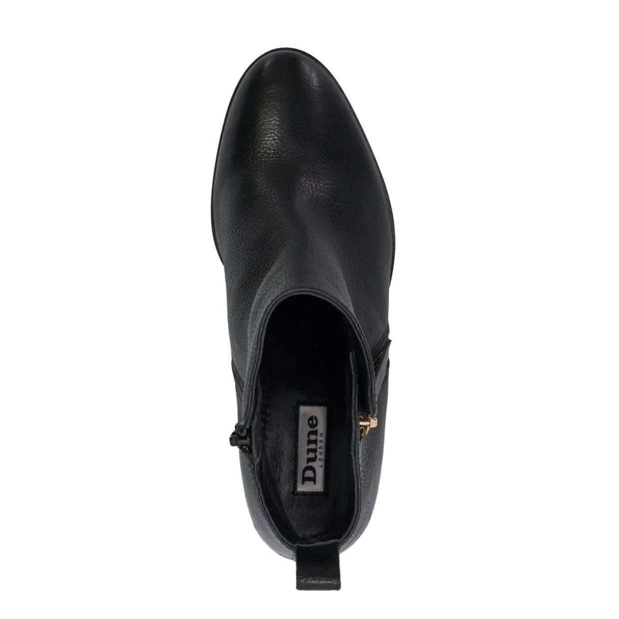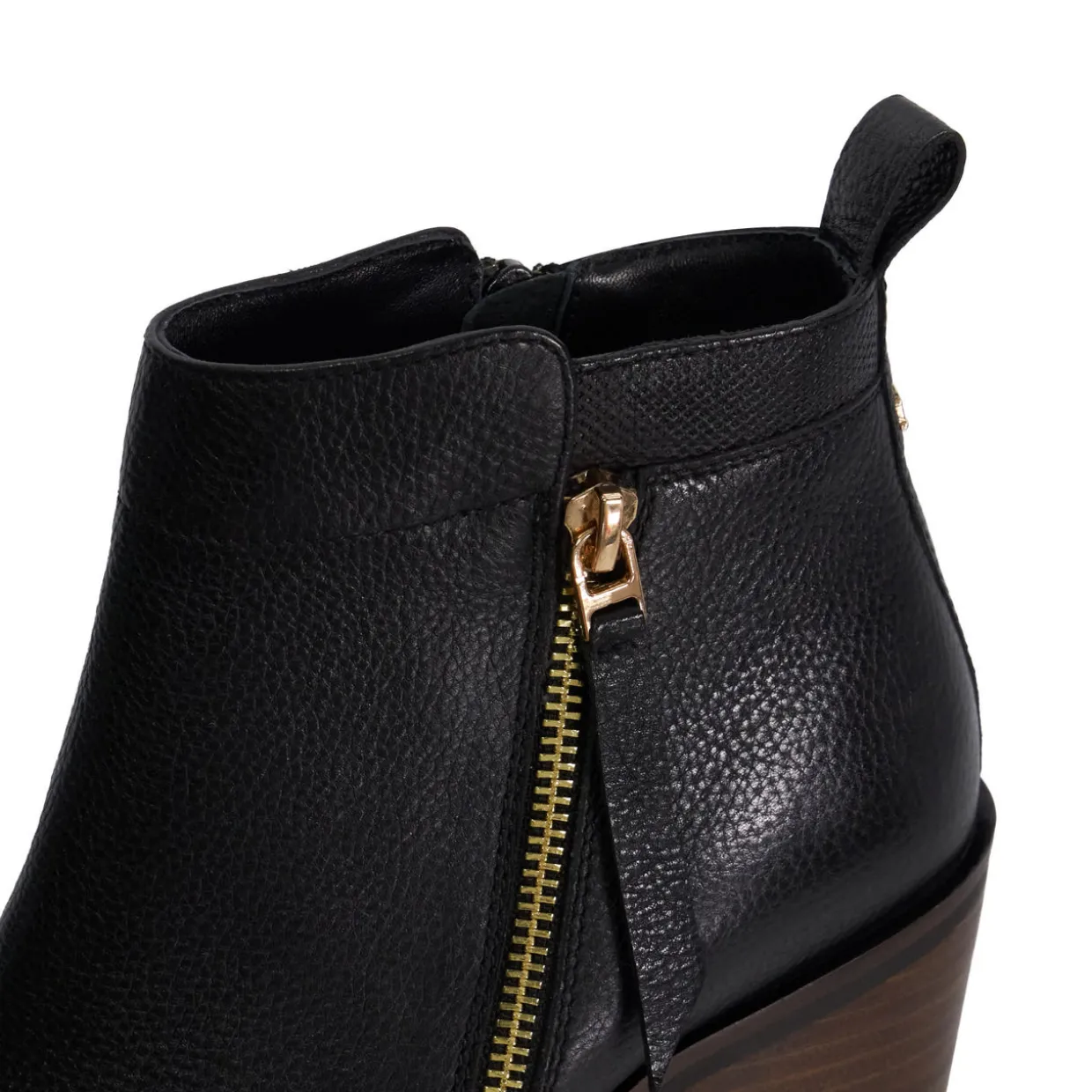 - Side zip, stacked block heel, pull tab, almond-shaped toe