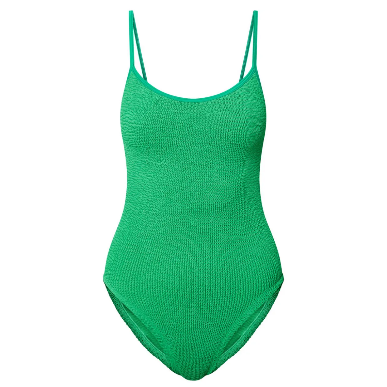 - Two spaghetti shoulder straps, scooped neckline, one-piece design, textured finish