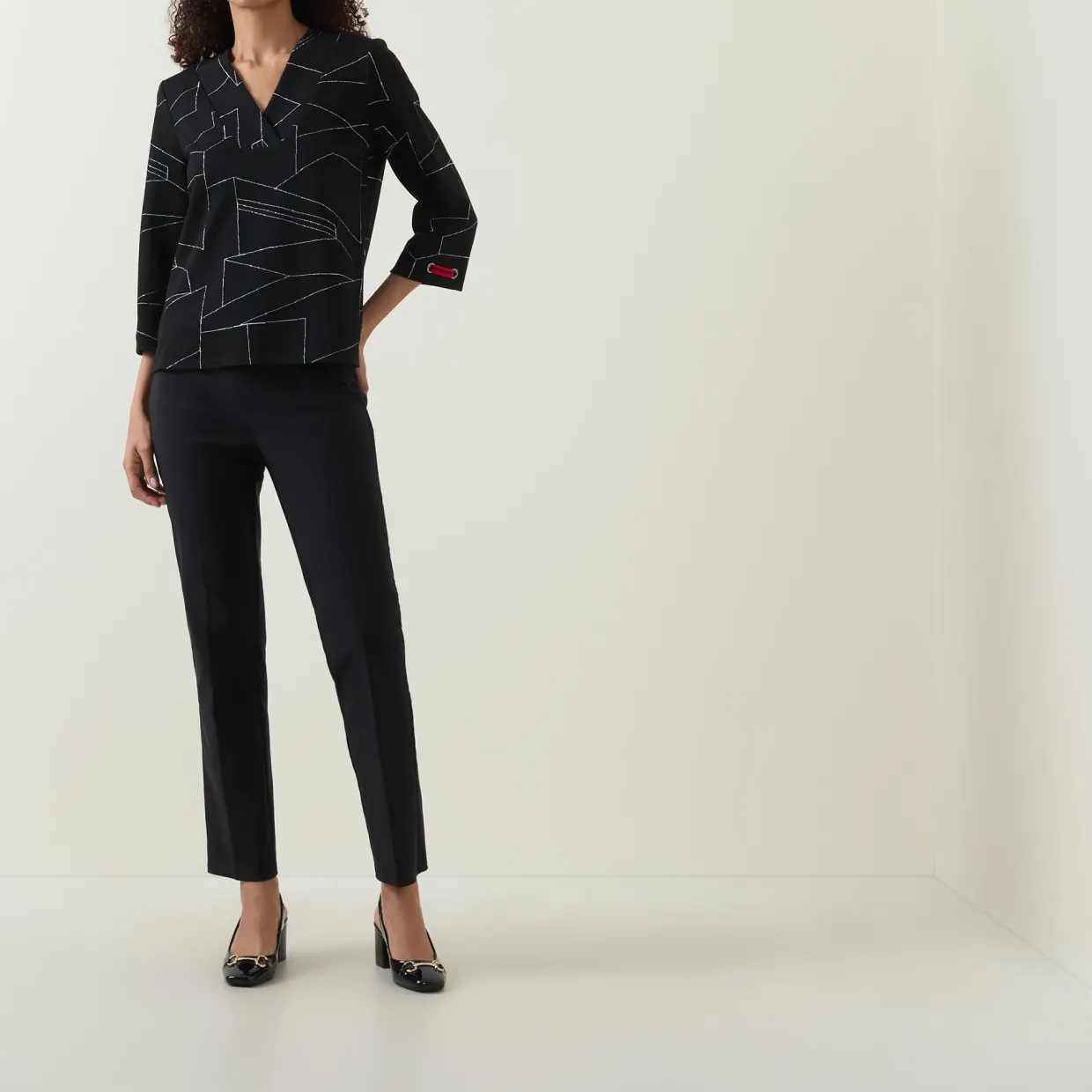 - Mid-length sleeves, V-neckline, embellished panelled design, tonal stitching, embellished cuffs, straight hemline, smooth fabric