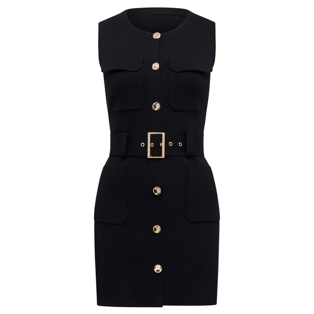 - Petite Collection’ piece, mini length, tailored style, round neckline, sleeveless, removable waist belt, gold-tone hardware