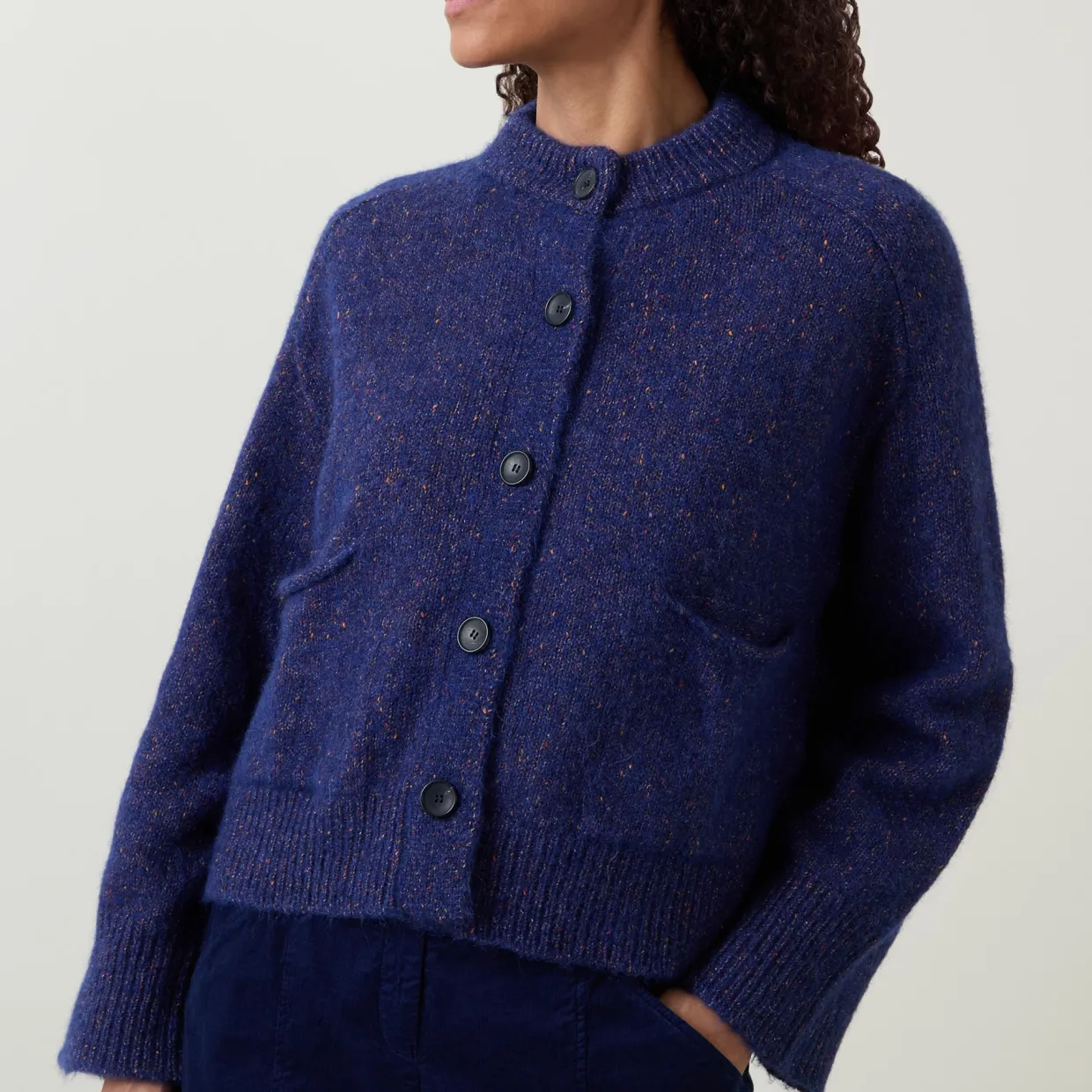 - High neckline, long sleeves, dropped shoulders, front button fastenings, two side patch pockets, ribbed hemline and cuffs, speckled design, knitted finish