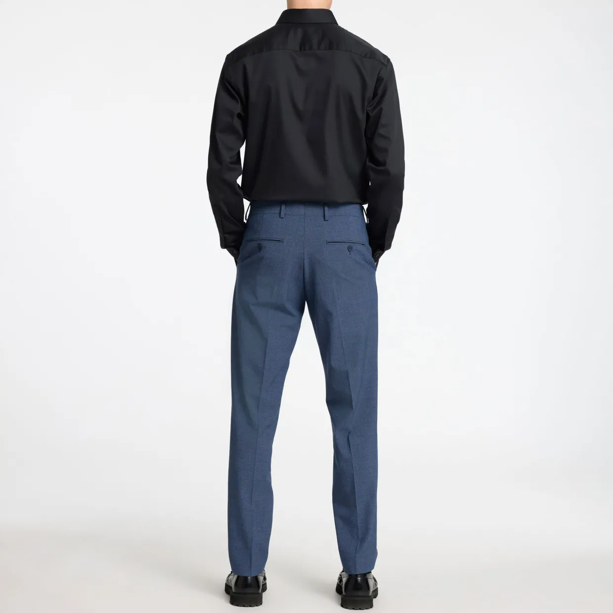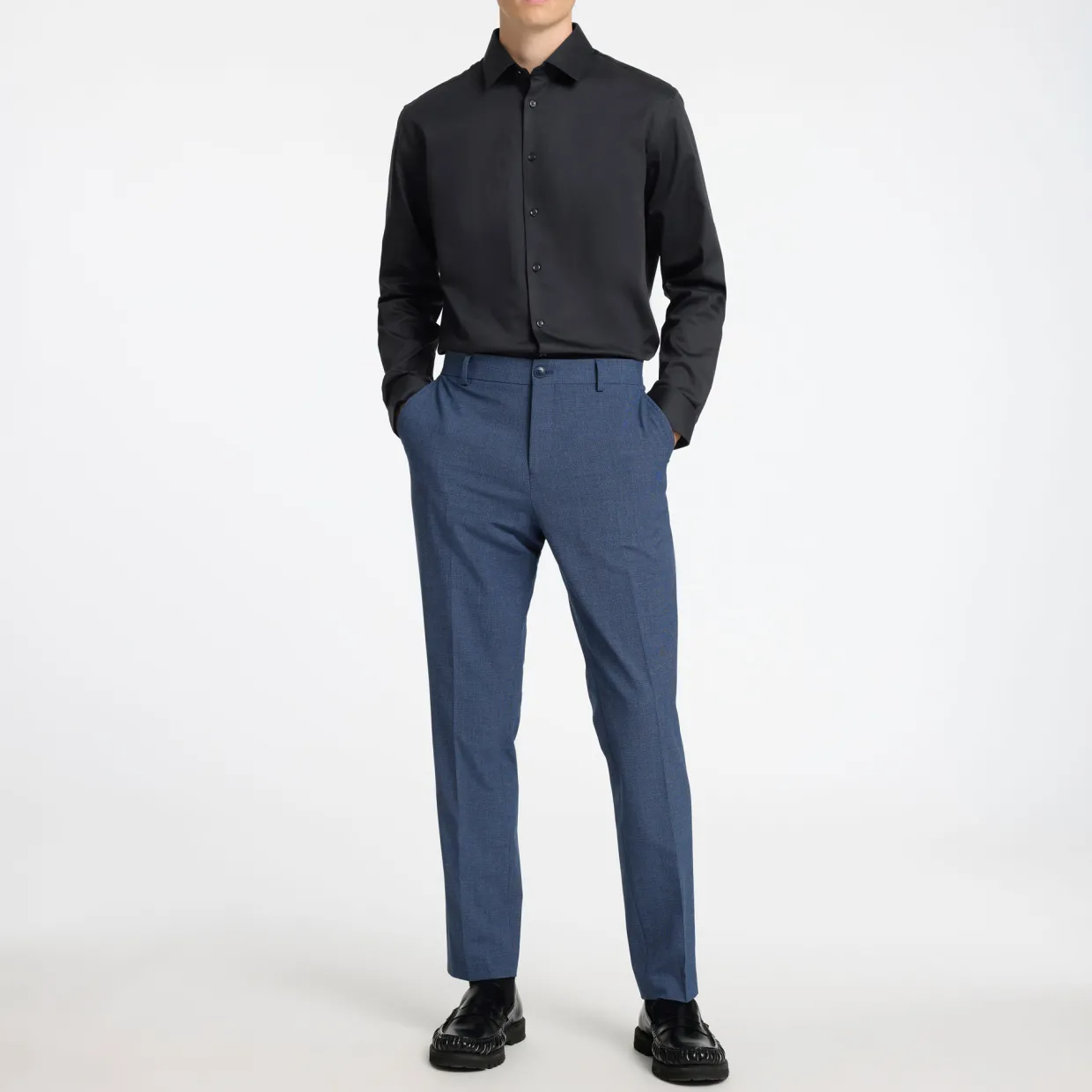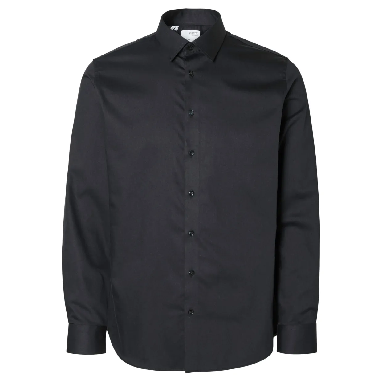 - Shirt collar, long sleeves, buttoned cuffs, button fastening, curved hem, treatment for a soft feel and comfortable wear, slim fit