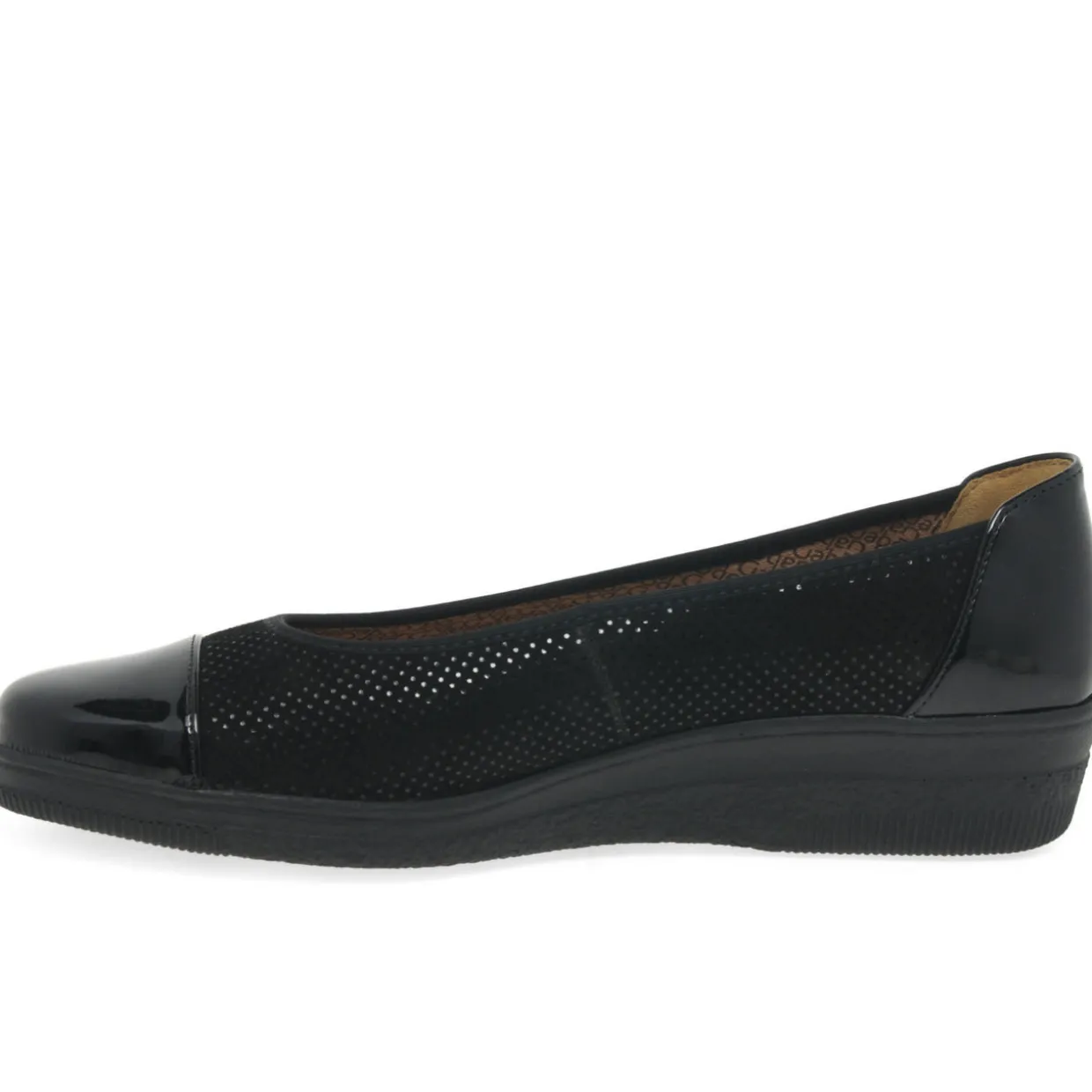 - Low wedge heel, contrast patent toe and heel cap, slip-on style, fine polka-dot finish
