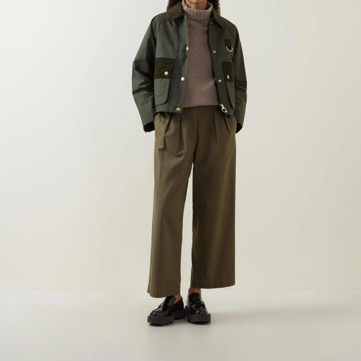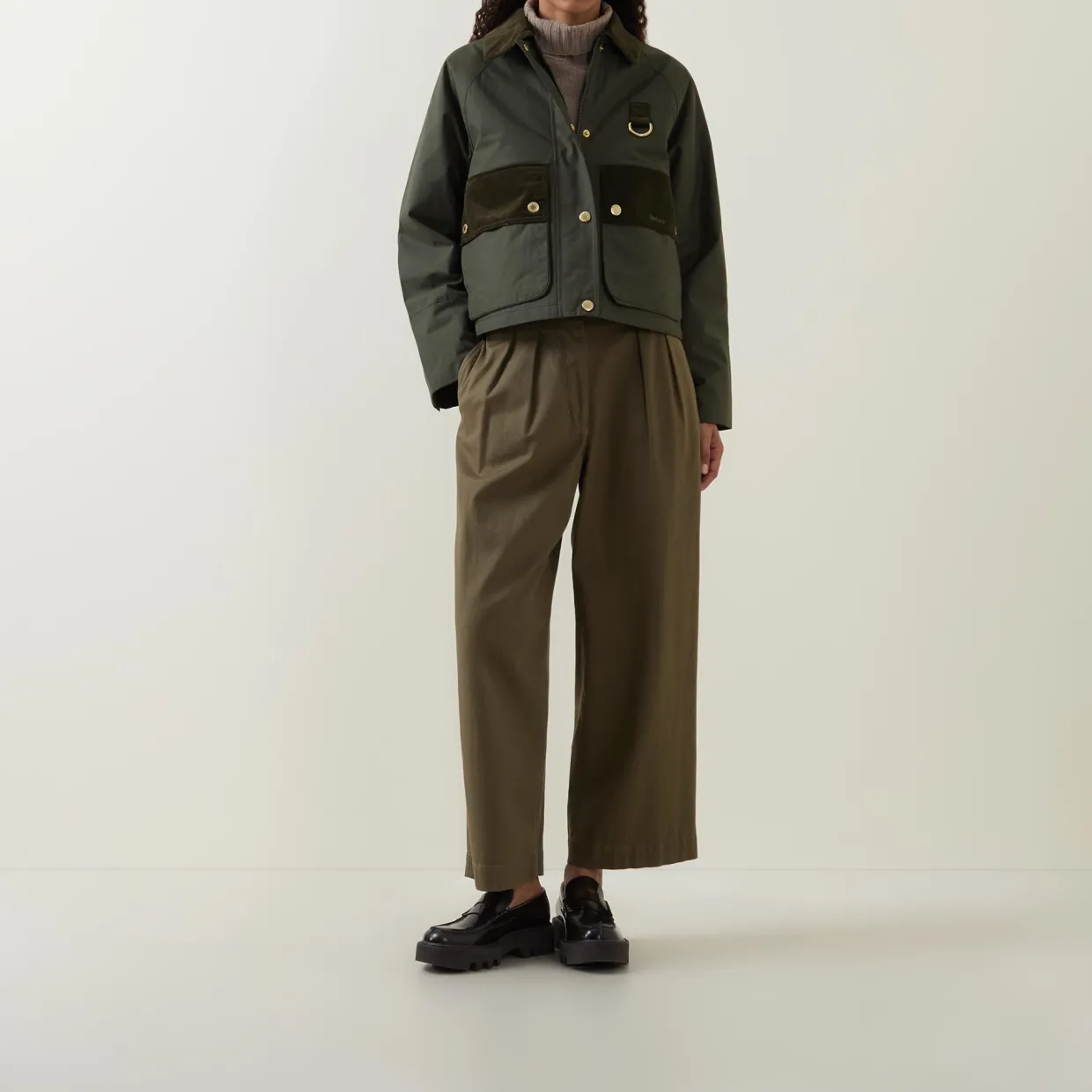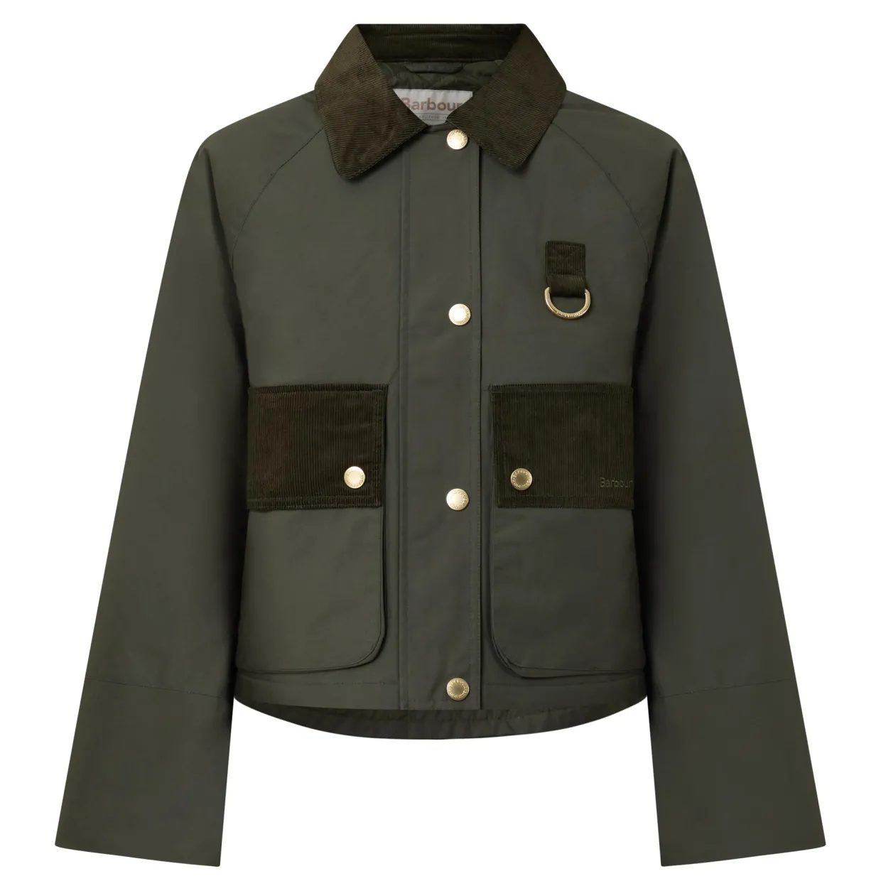 - Corduroy collar, long sleeves, snap buttoned cuffs, front branded zip fastening with additional snap button placket, two front flap pockets with snap button closures, straight hem, cropped length, D-ring detail, embroidered logo detail, corduroy finishes