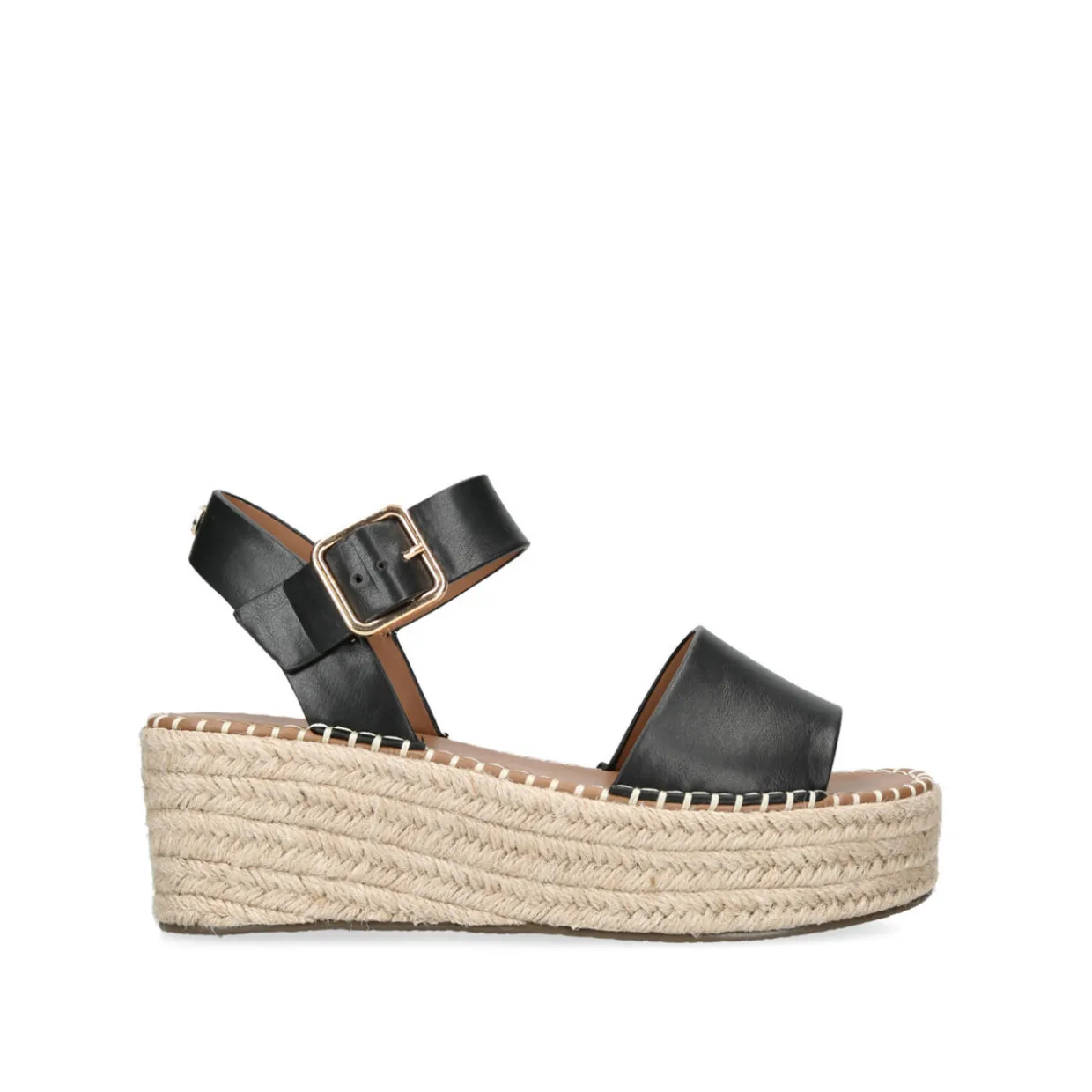 - Gold buckle on ankle strap, almond toe, platform heel with rope espadrille detail, platform toe detail