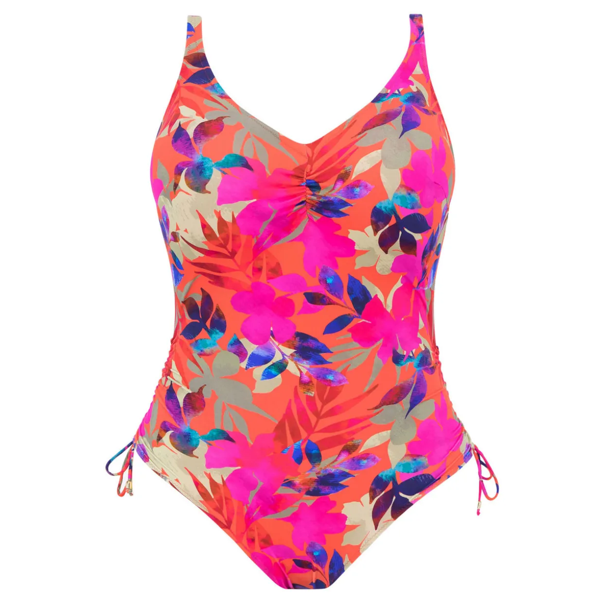 - V-neckline, concealed underwiring, adjustable tie-sides to adjust ruched tummy area and leg coverage, low back, fully lined, cheeky coverage, tropical leaf print