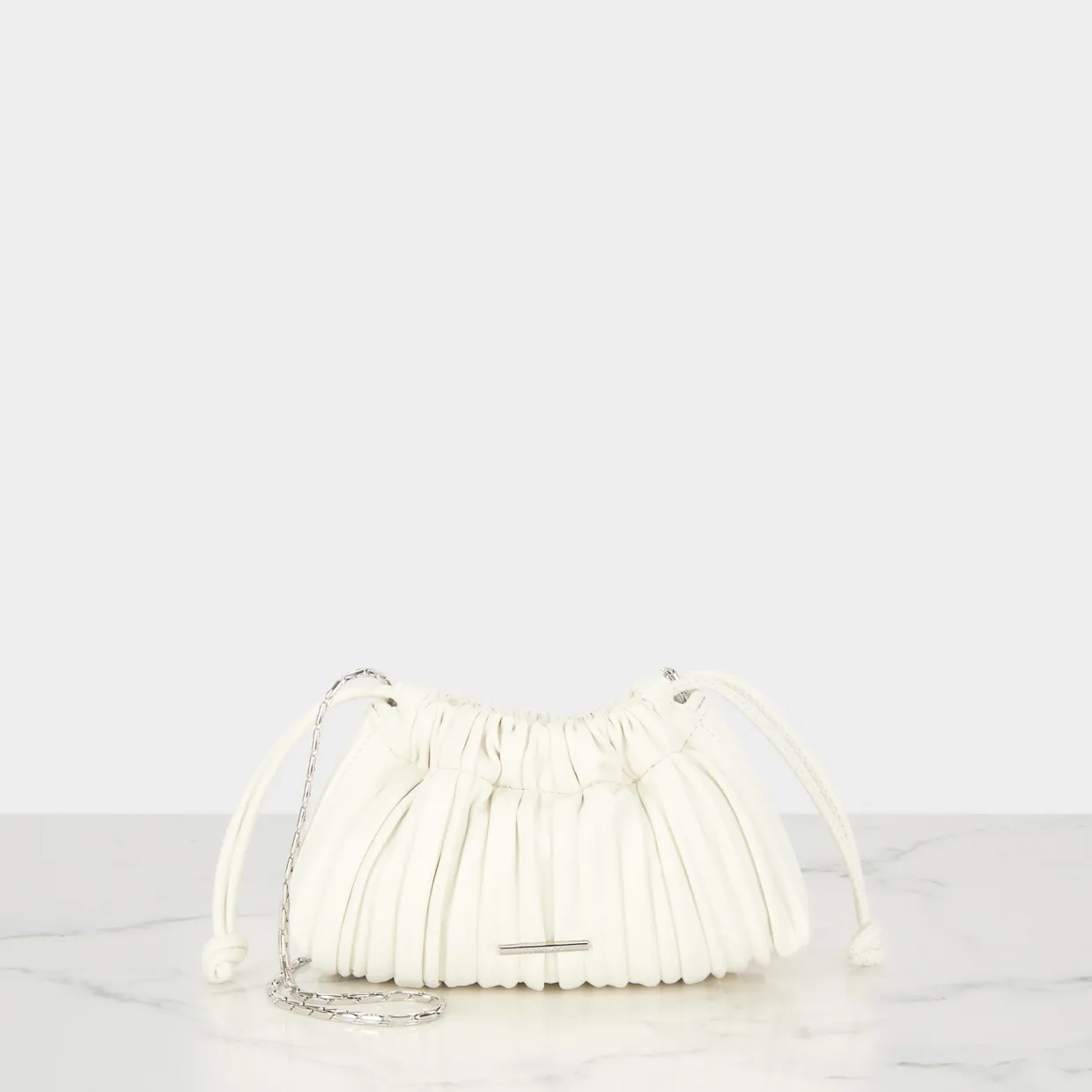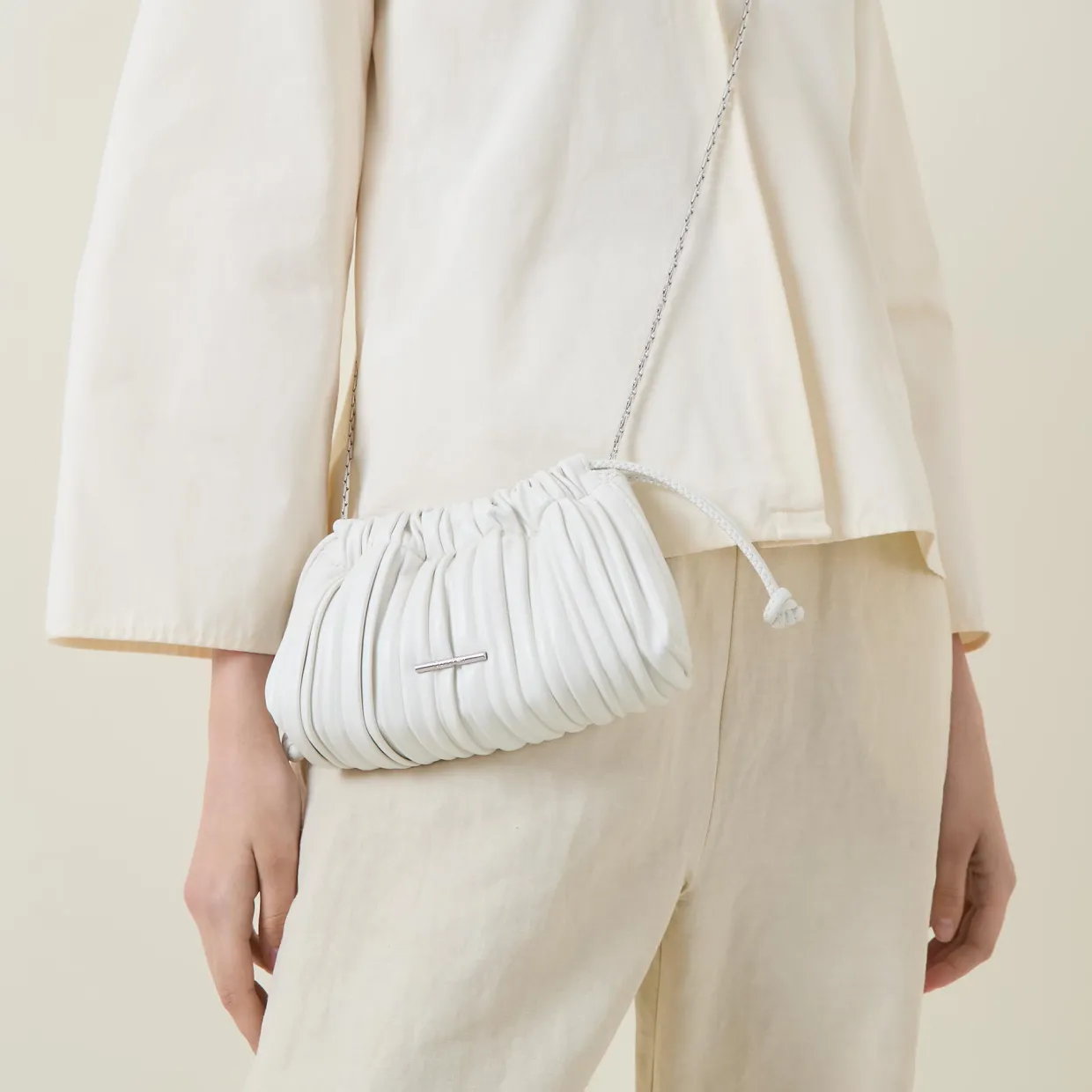 - Drawstring closure, gathered faux leather finish, crossbody chain strap, interior slip pocket