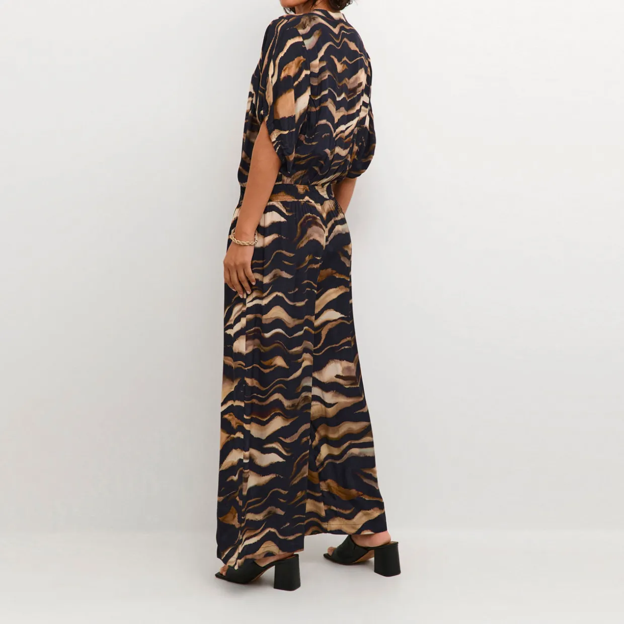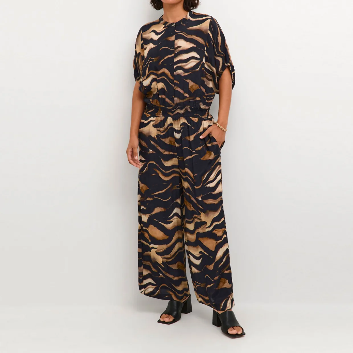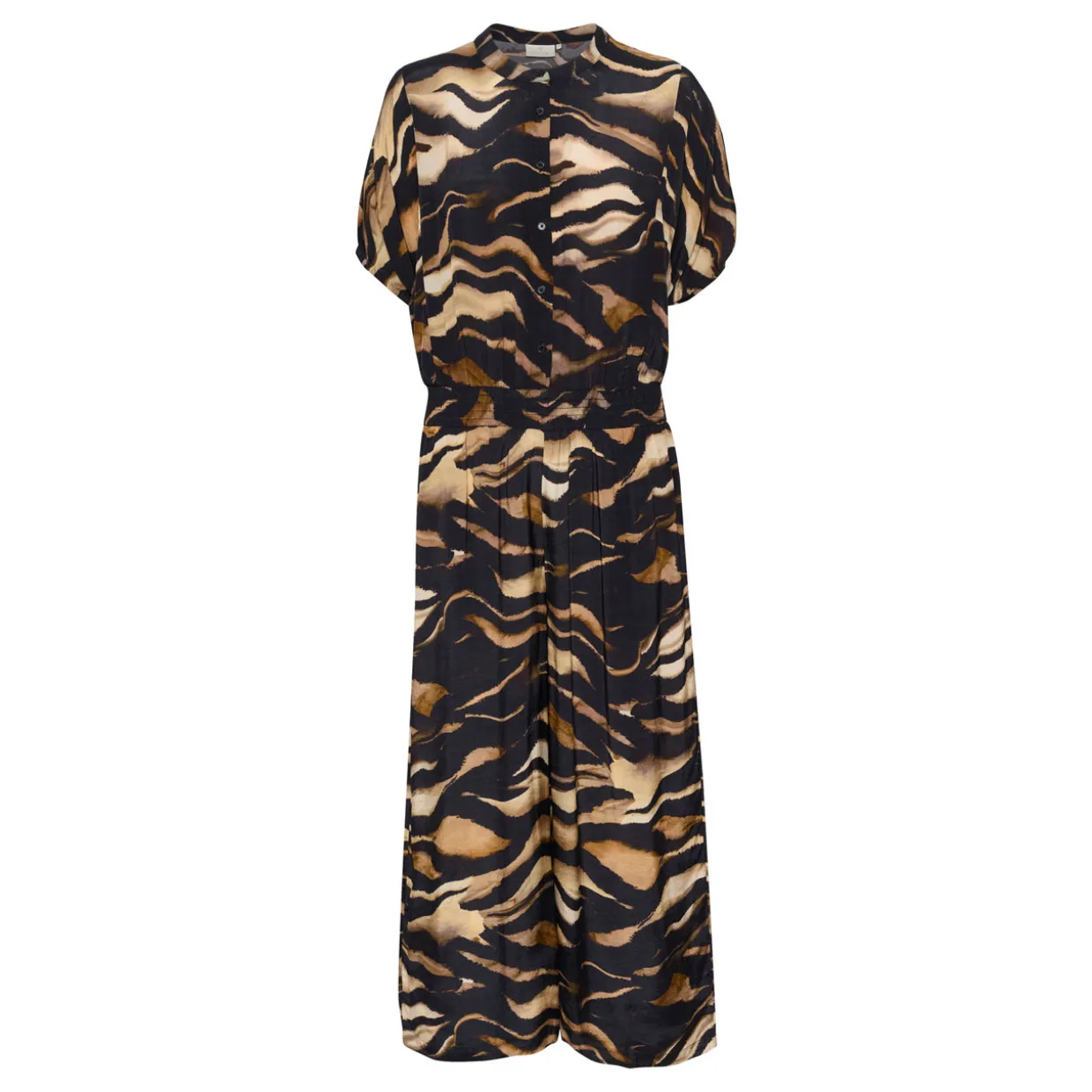 - Round neckline, half button fastening, short sleeves, wide-cut legs, animal print, fitted waistband, side entry pockets